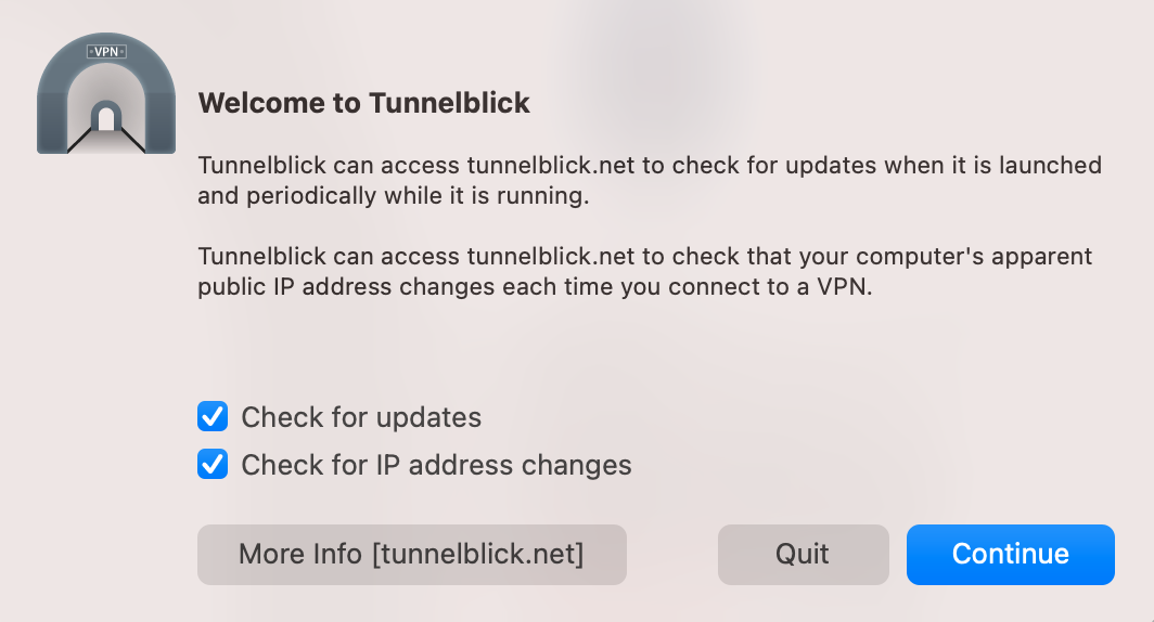 - Once the installation is complete, you will see a pop-up notification asking you if you want to launch Tunnelblick now. (An administrator username and password will be required to secure Tunnelblick). Click Launch.