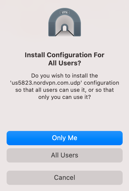 - A pop-up will appear, asking you if you want to install the configuration profile for your current user only or for all users on your Mac. Select your preferred option.