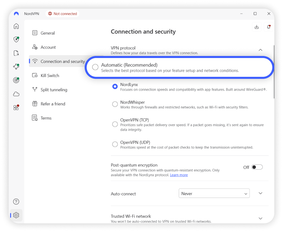 Auto (Recommended) protocol finds the fastest connection to your desired server, resulting in a smooth browsing and streaming experience. Moreover, when using other protocols, the app may ask you whether you agree to change the connection protocol to enable some of NordVPN's features, however, when using the Auto (Recommended) protocol, the NordVPN app will not ask you such questions.