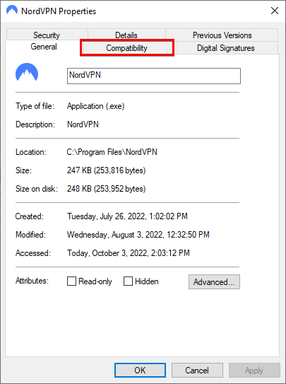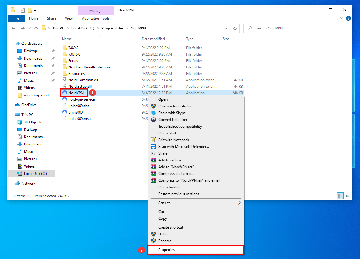 - Find the NordVPN file and right-click on it. A window will open up, there choose properties and left-click on this option.