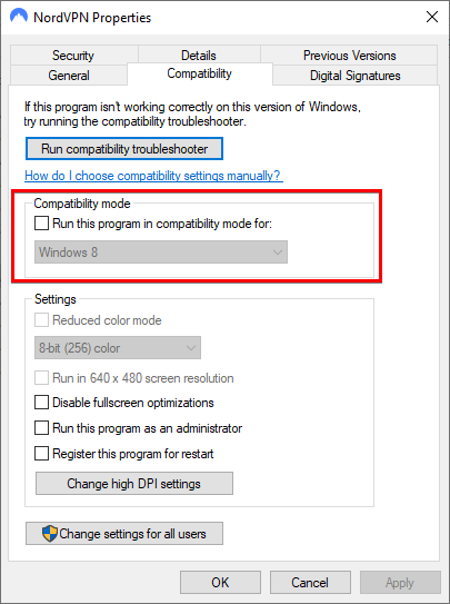 Run this program compatibility mode for: should be disabled. If you can see a checkmark next to it - remove it by right-clicking on the check-box and pressing apply in the lower right corner.