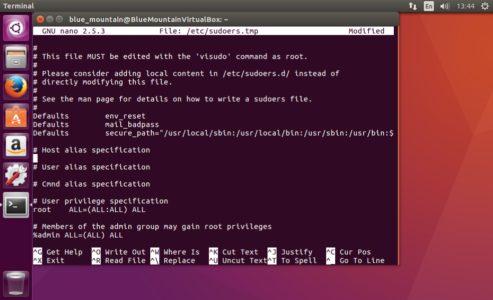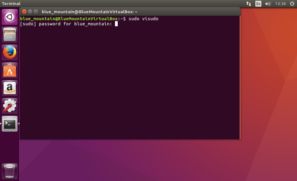 4. Open Terminal (Ctrl + Alt + T) and run sudovisudo command. Afterwards, you will be prompted your administrator password, please enter it.