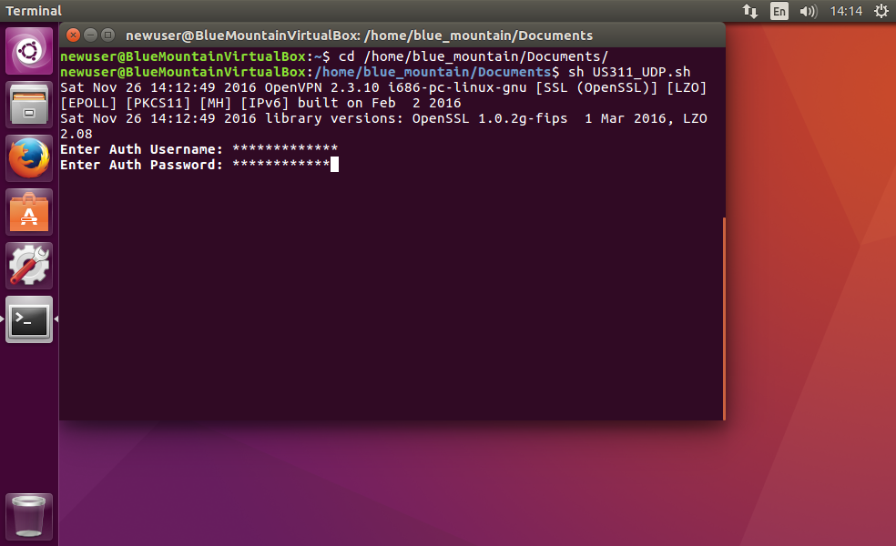 These are the instructions to connect non-administrative account (newuser in this example) to VPN using Linux. The instructions were made using Ubuntu 16.04 LTS and connecting to US #311 server using UDP protocol. Before following these instructions, please make sure at least 1-7 steps of our Linux tutorial has already been completed.