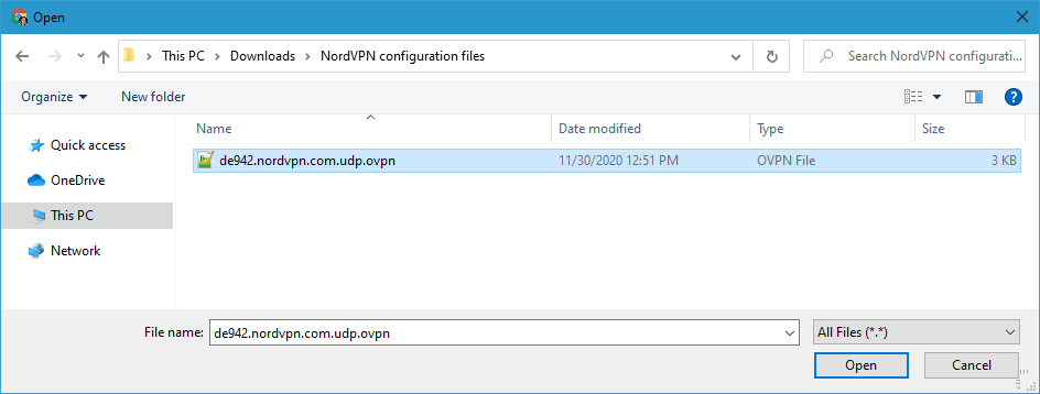 2. Select the configuration file you have just downloaded and press Open. If you need help deciding which configuration file to choose, feel free to contact our customer support team.