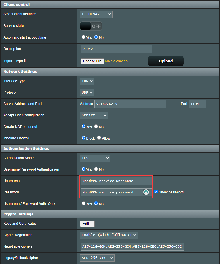 4. Once the page has refreshed, most fields will be filled in automatically, except for your NordVPN service username and password — you will have to type those in manually.