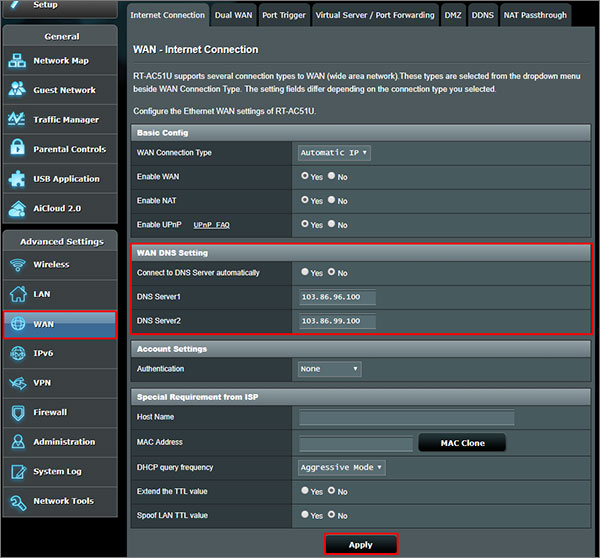 3. Now you need to configure NordVPN’s DNS settings. In the left sidebar, click WAN. In the Connect to DNS Server automatically field, select No and fill in NordVPN’s DNS servers as follows: