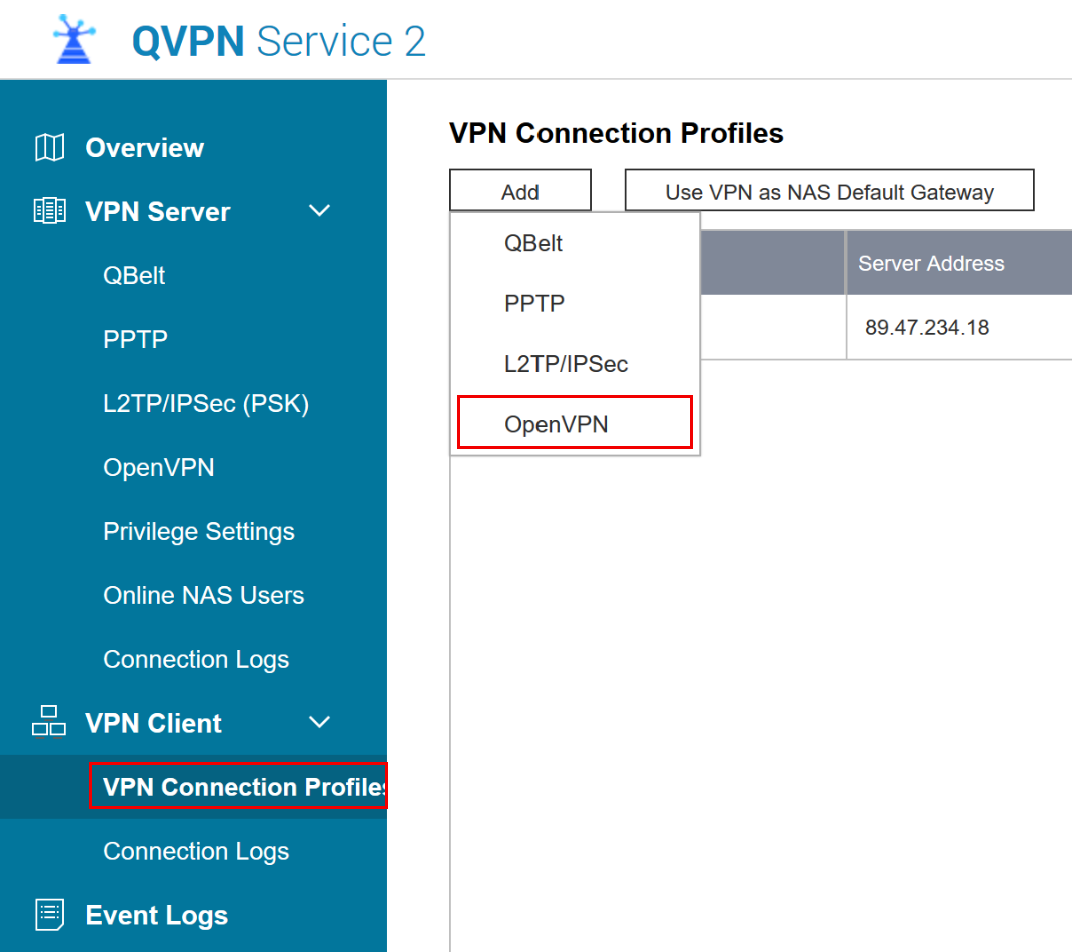1. Access your QNAP and select QVPN Service -> VPN Client -> VPN Connection Profiles -> Add -> OpenVPN.