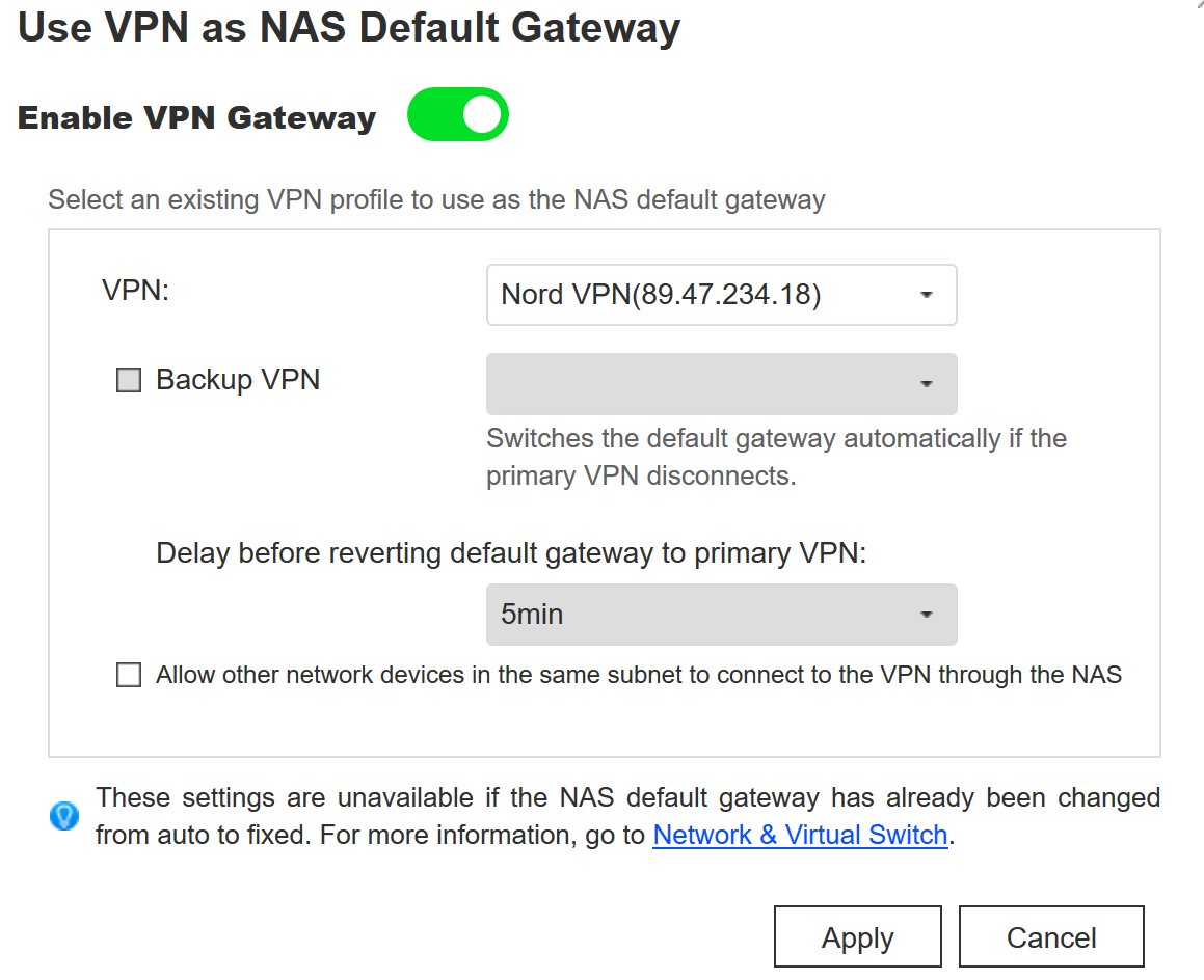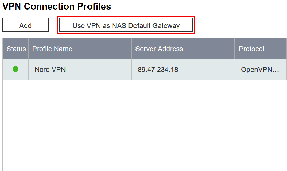 4. You should see the new connection visible. Select the profile and click Use VPN as NAS Default Gateway.