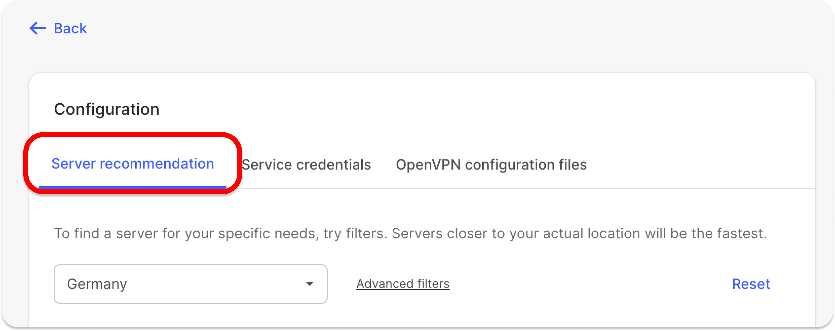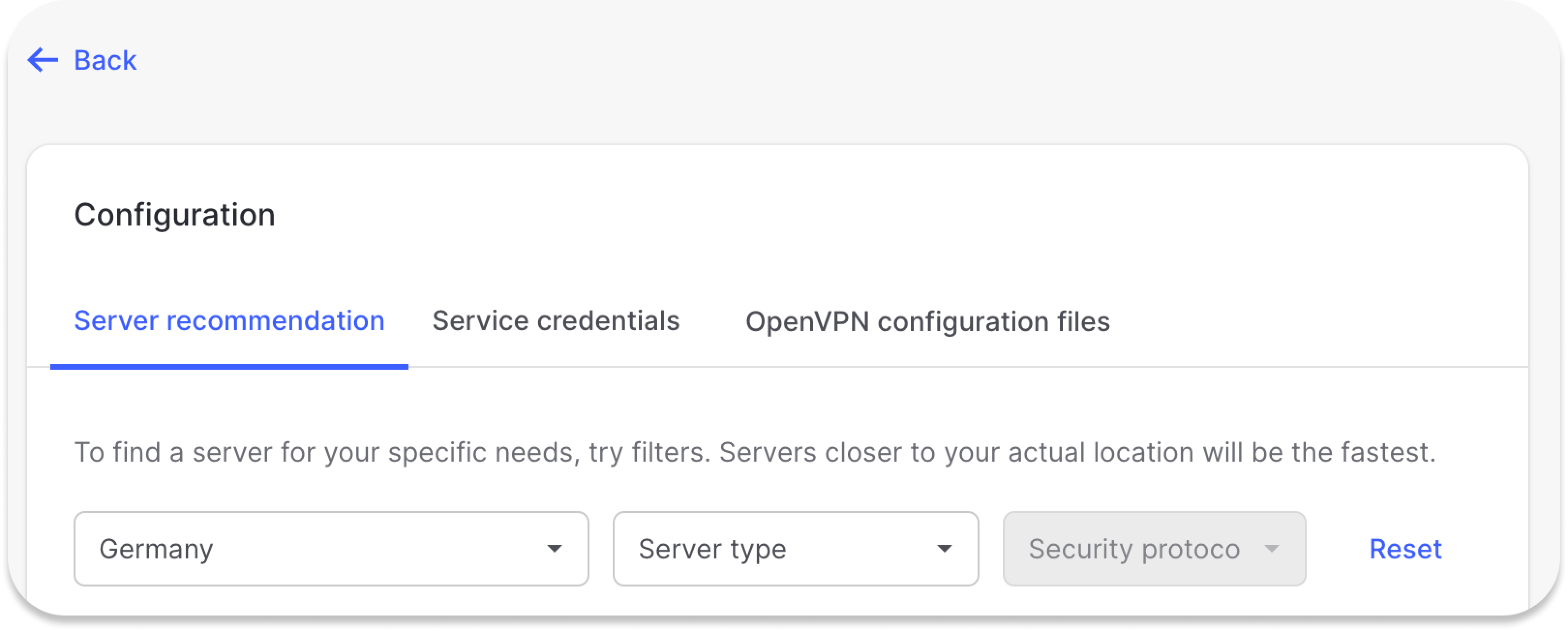 By pressing Advanced filters you can further customize the recommended servers by selecting the Server type and the Security protocol.