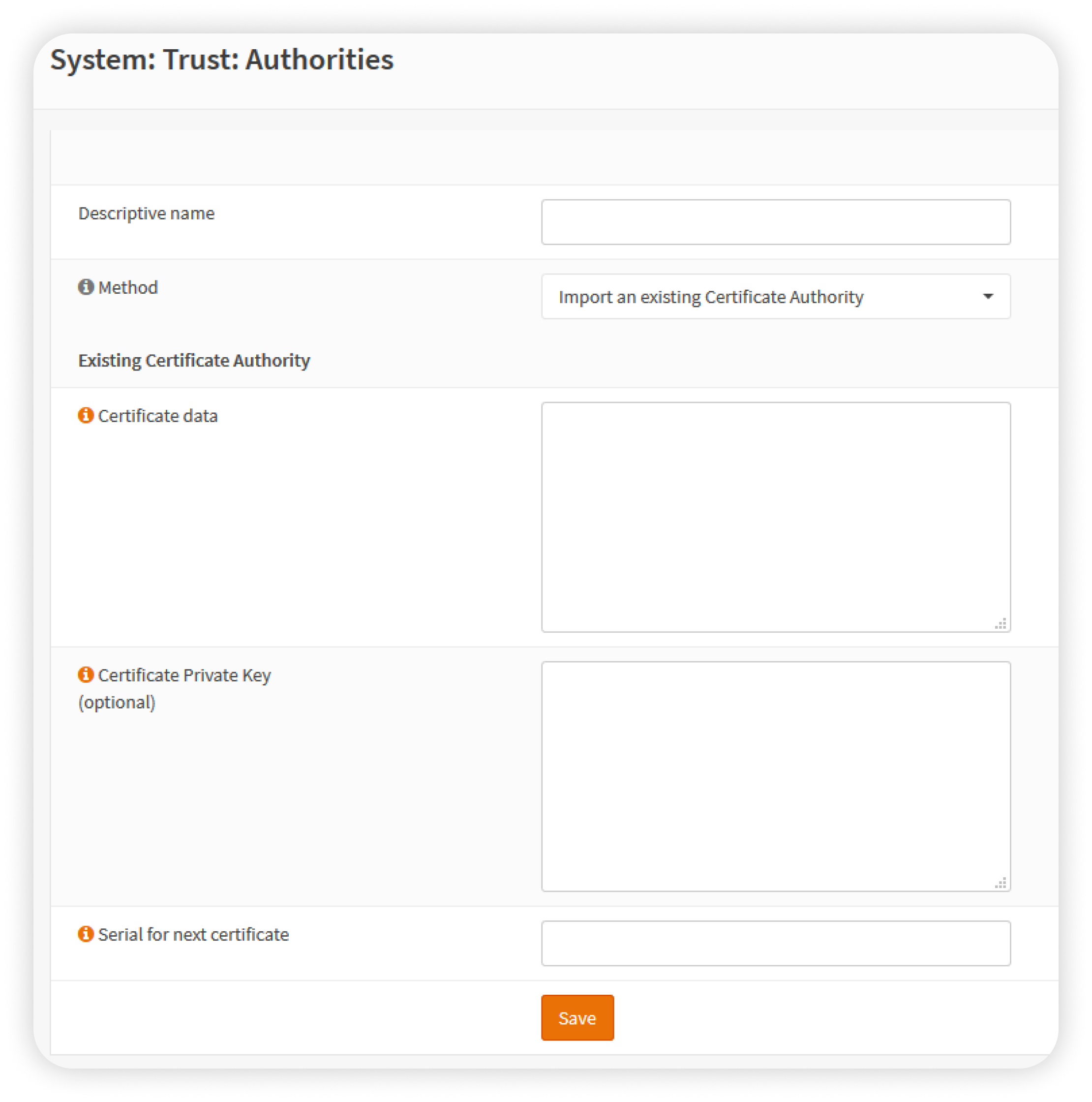 - Navigate to System -> Trust -> Authorities and click on the +Add button.