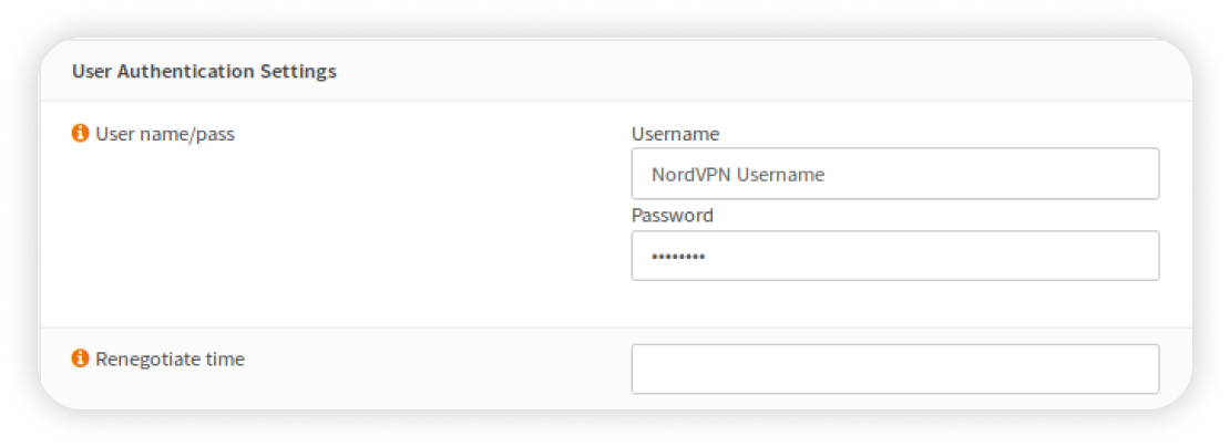 User name/pass: Fill in NordVPN service credentials, username, and password.