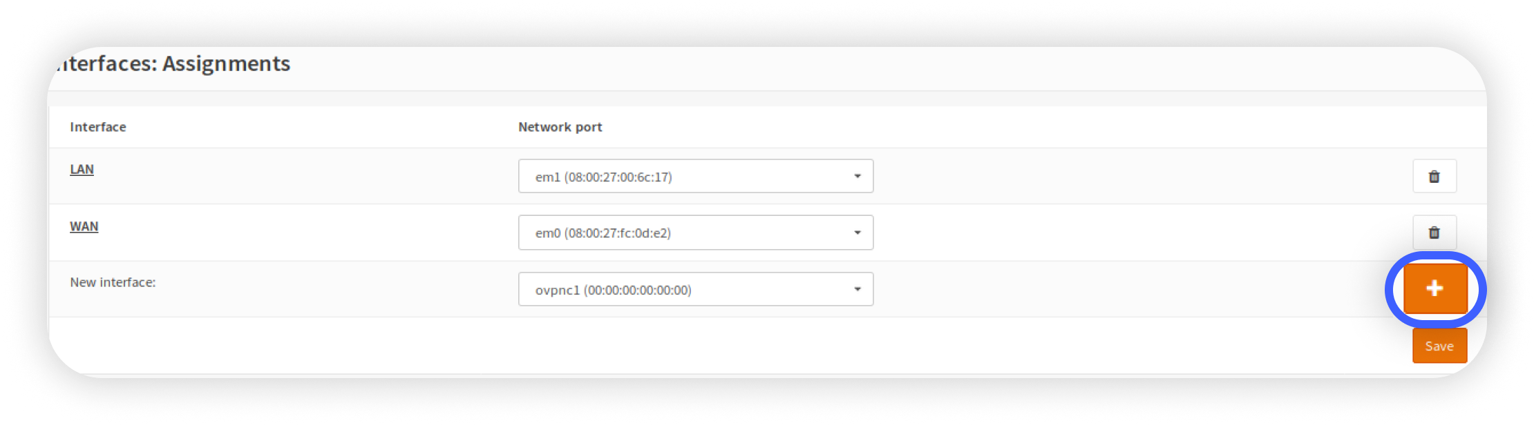 - Navigate to Interfaces -> Assignments and click on + near New Interface. By default, it is ovpnc1.