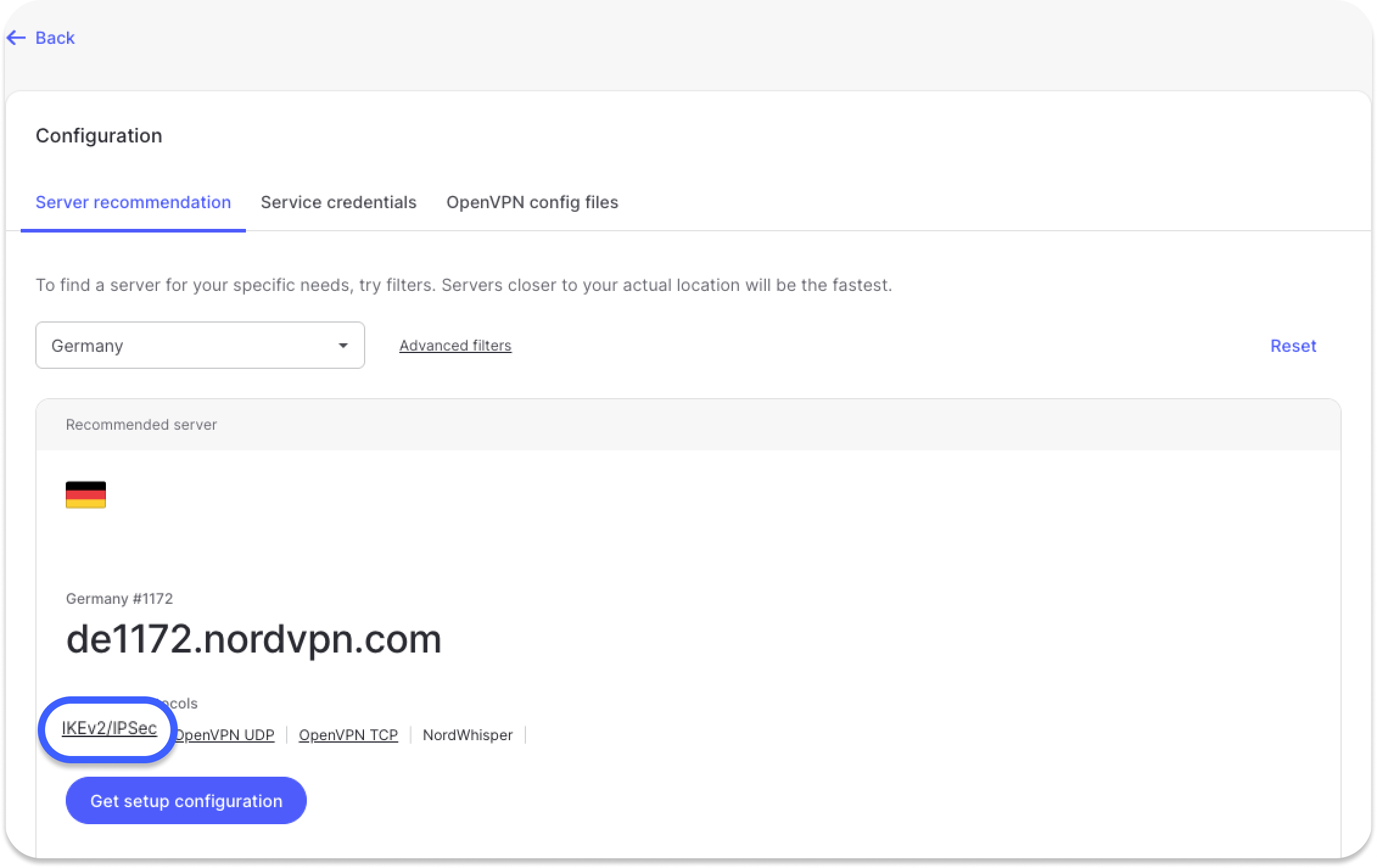 - By pressing Advanced filters you can further customize the recommended servers by selecting the Server type and the Security protocol.