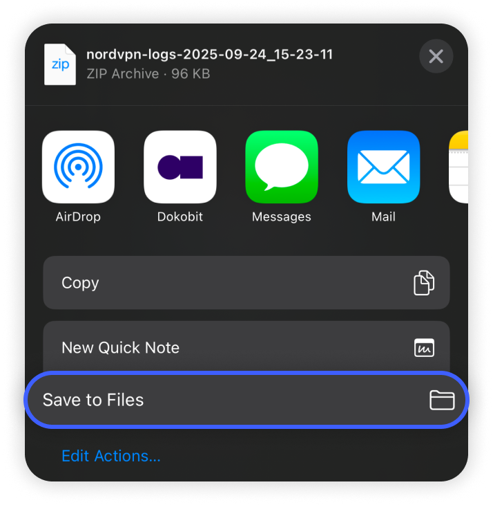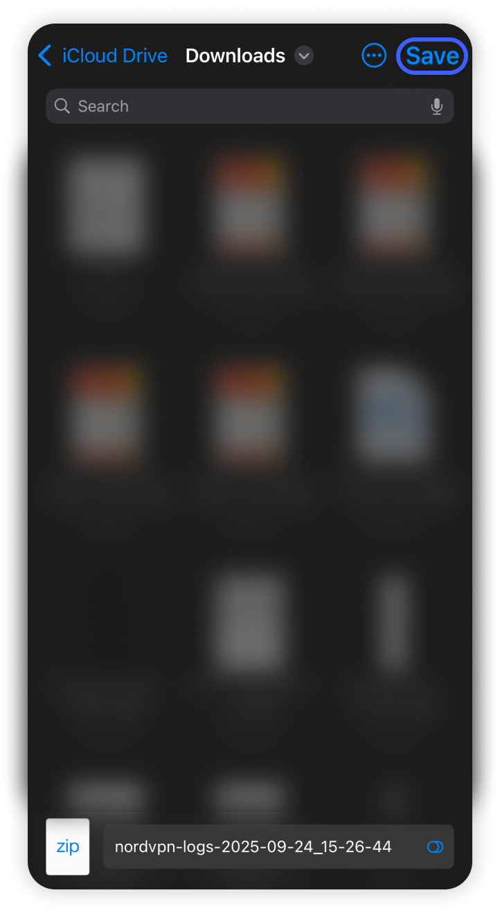 - If you wish to save the diagnostic logs to your files, tap on the save to files button: