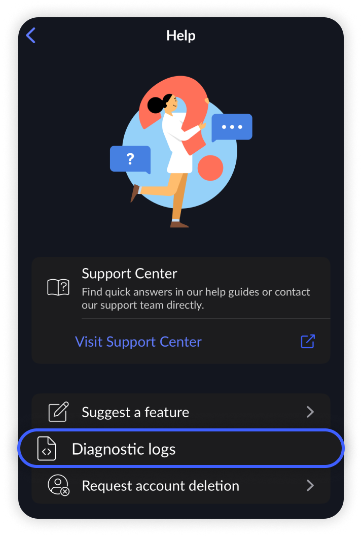 - Next, tap on the diagnostics logs button: