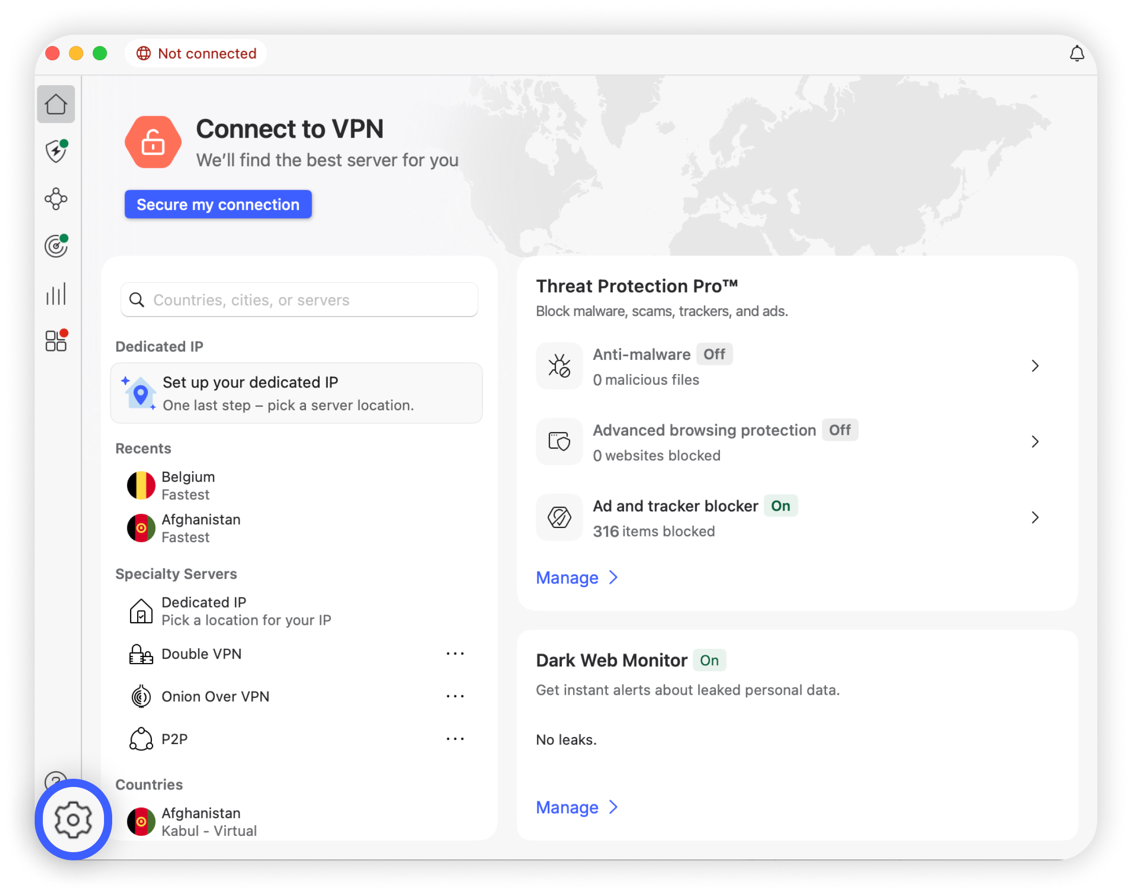 1. Open the NordVPN application and select the cog icon located on the lower-left side to access settings: