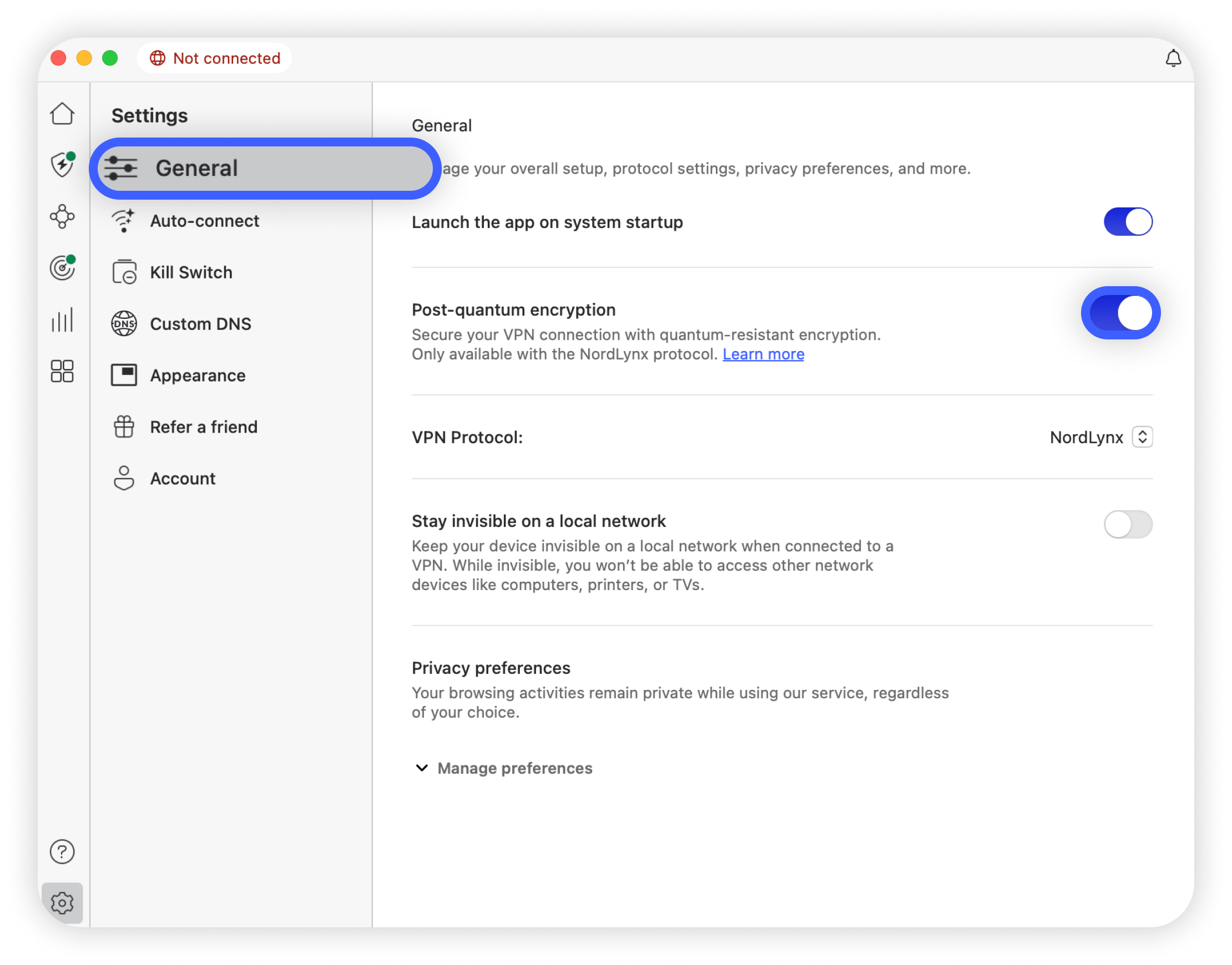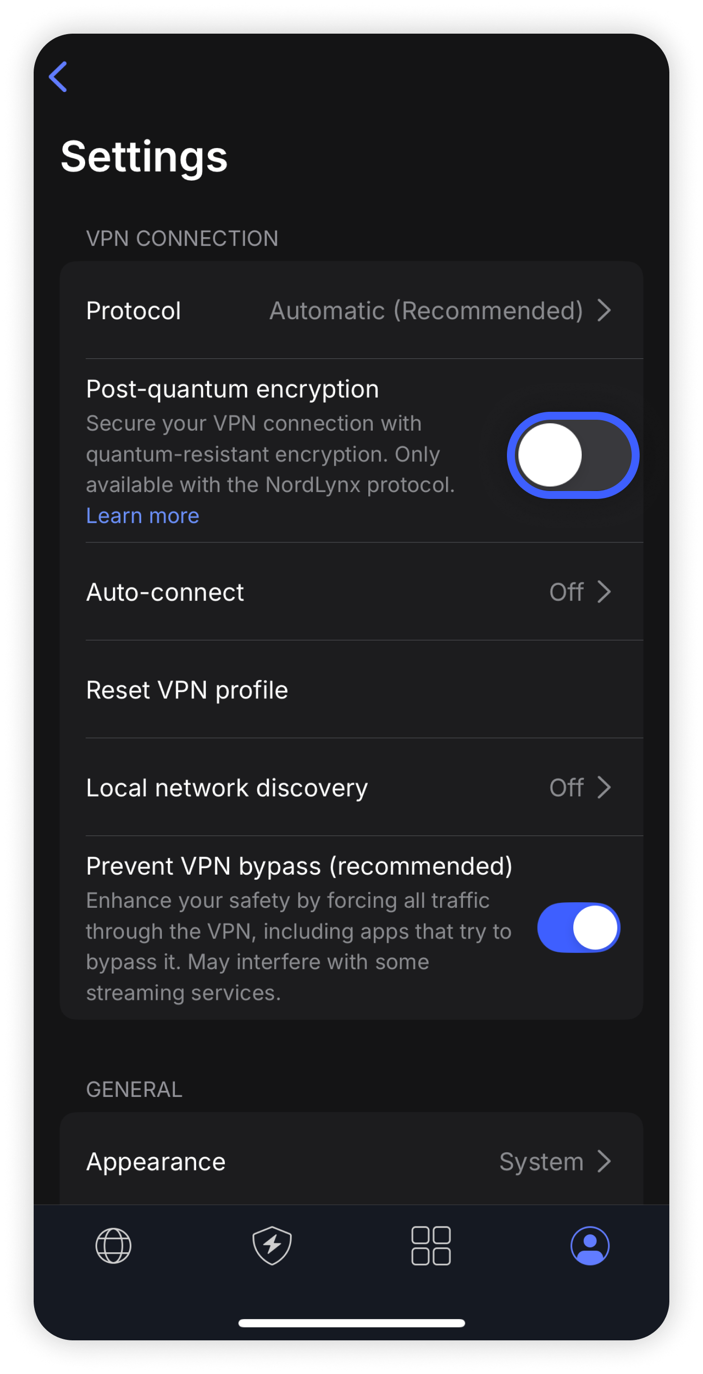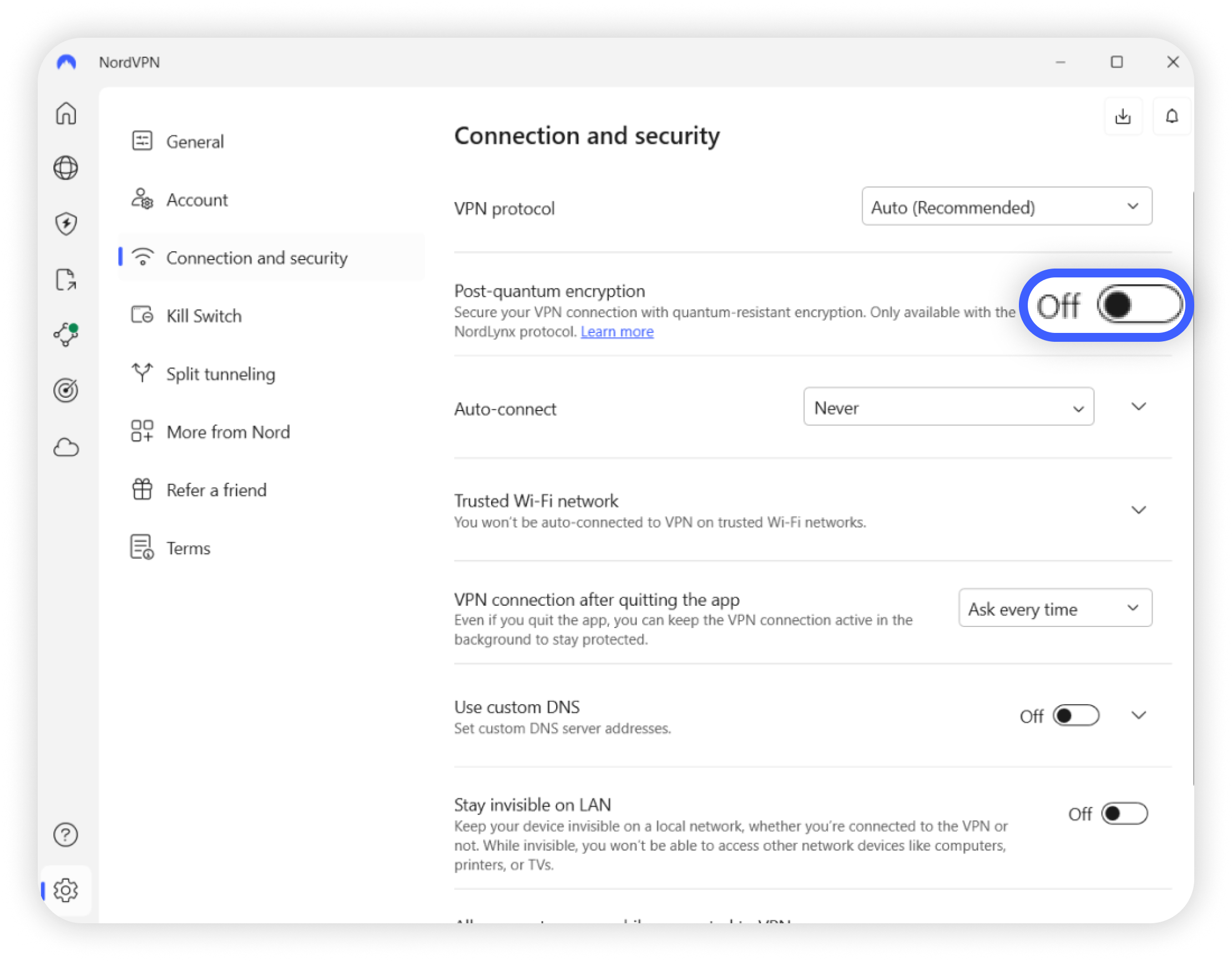 Post-quantum encryption protects your VPN connection against potential quantum computer attacks. Currently, this encryption works with the NordLynx protocol only, therefore post-quantum encryption will be disabled when you use a dedicated IP, other protocols, Obfuscated servers or Meshnet..