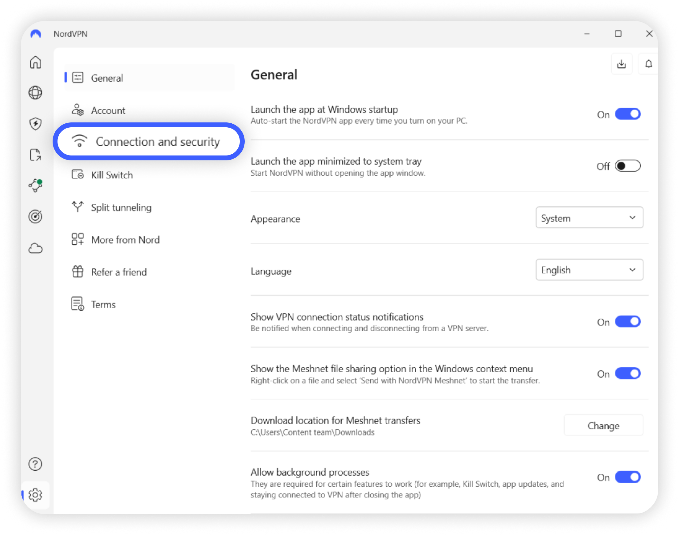 • Meshnet Feature: Meshnet, which turns on private connections across devices, is incompatible with post-quantum protection. If both features are active, the following error will display: