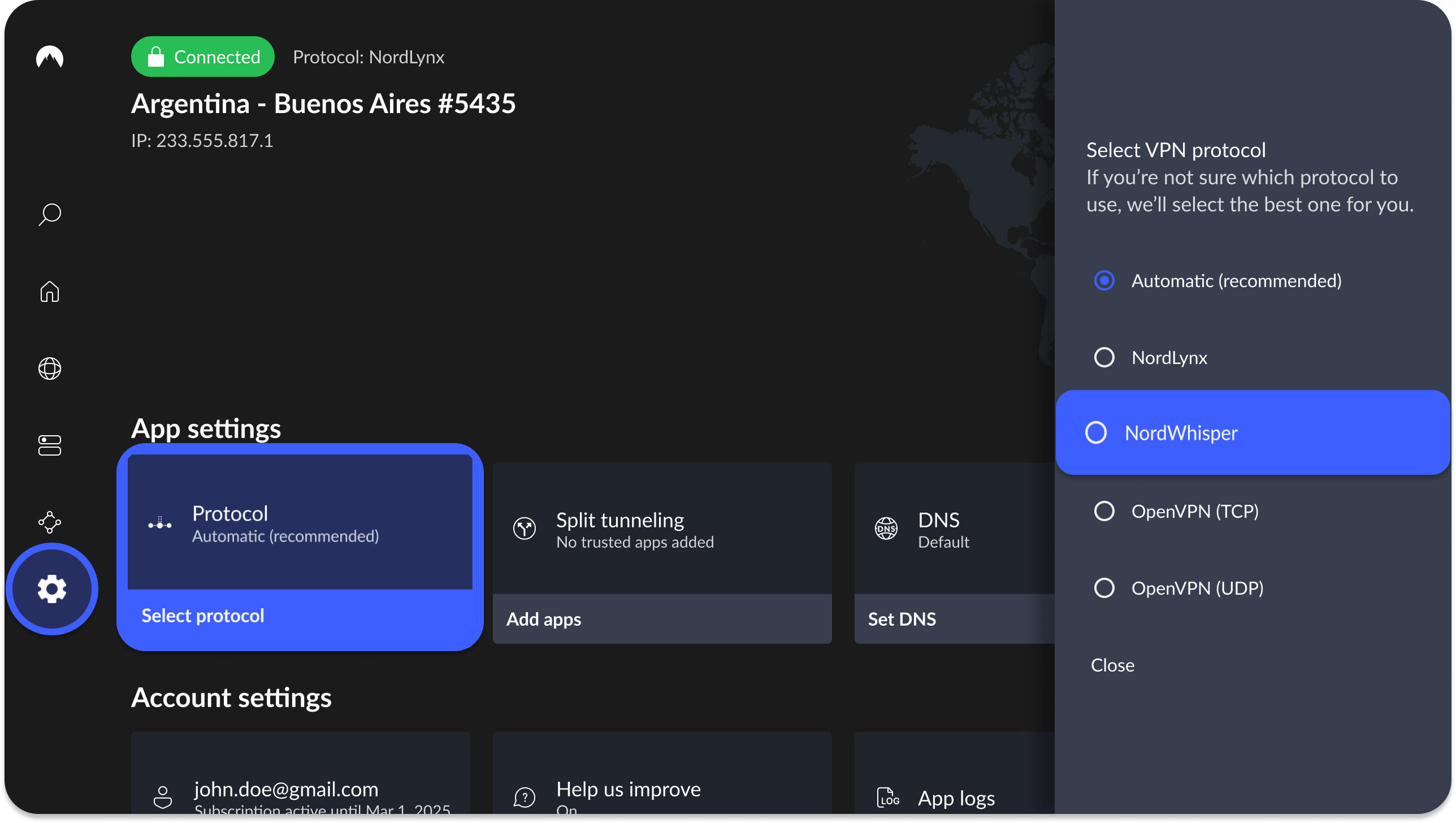 In this article, you will learn how to change your protocol to NordWhisper.