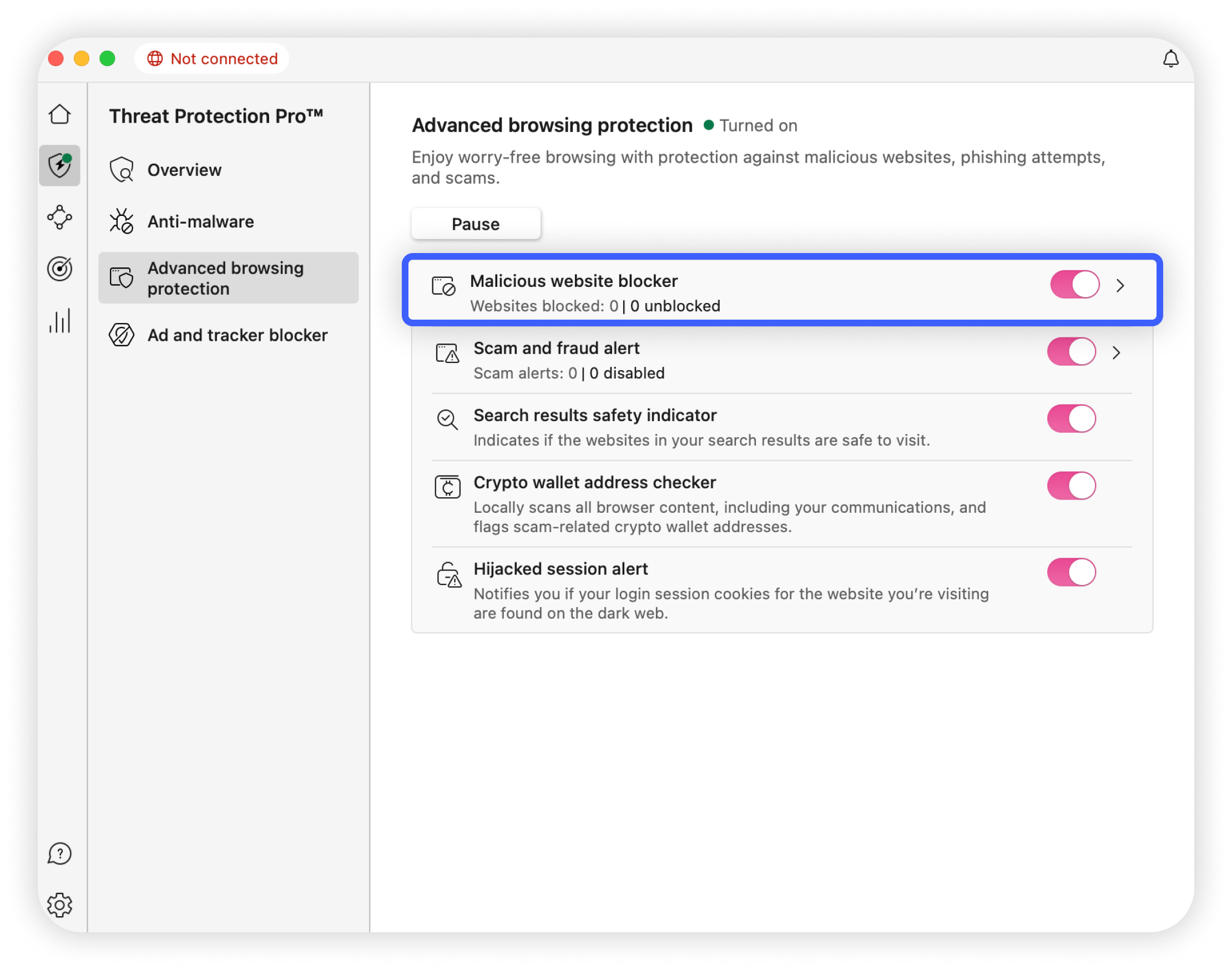 The malicious website blocker, part of Threat Protection Pro™, acts as a first line of defense against web-based threats. It automatically blocks dangerous websites that are known to distribute malware or engage in other malicious activities.