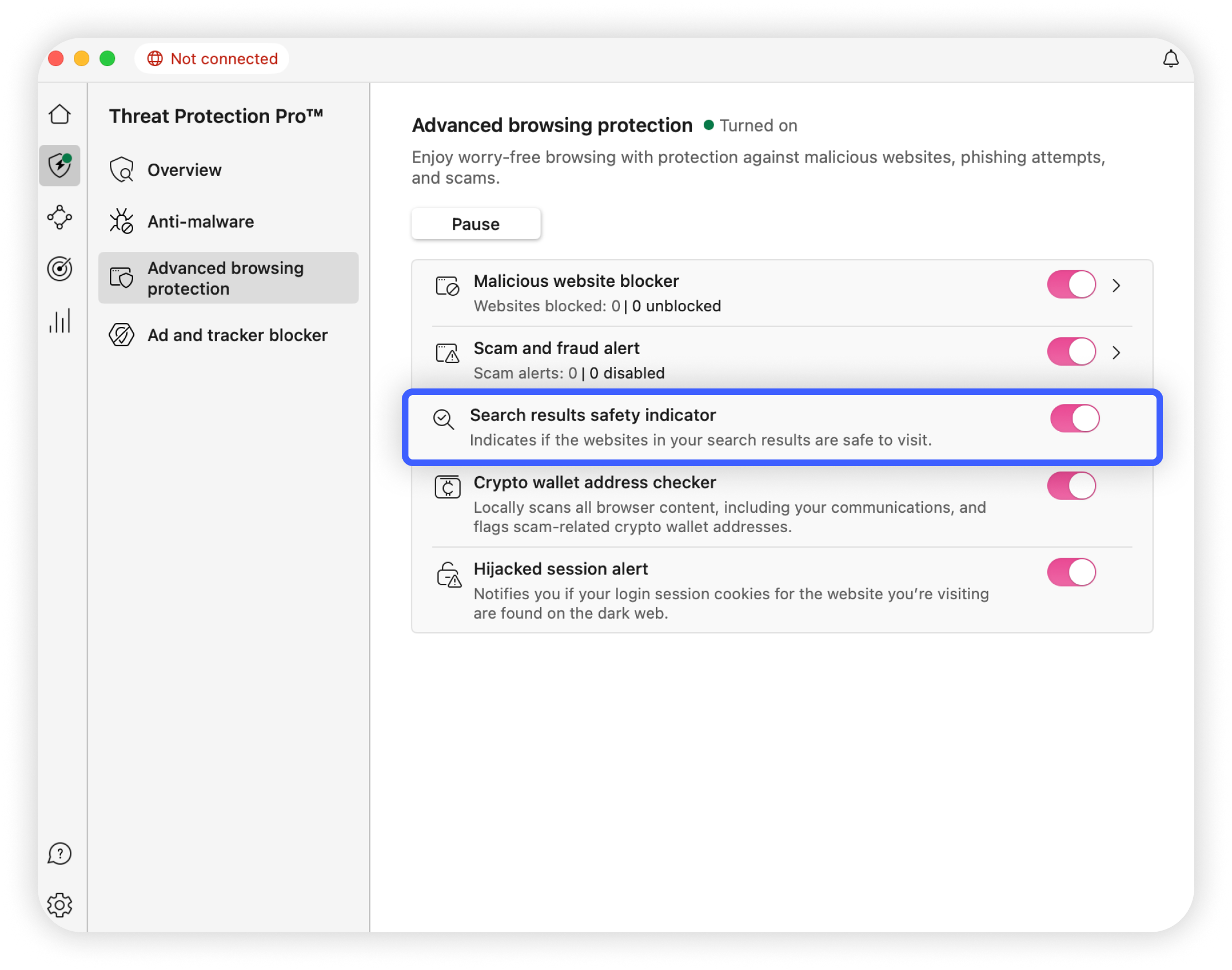 The search results safety indicator, a feature of Threat Protection Pro™, adds safety icons next to links in your search results. It helps you instantly identify and avoid dangerous websites directly from the search page on Google, Bing, and DuckDuckGo before you even click.