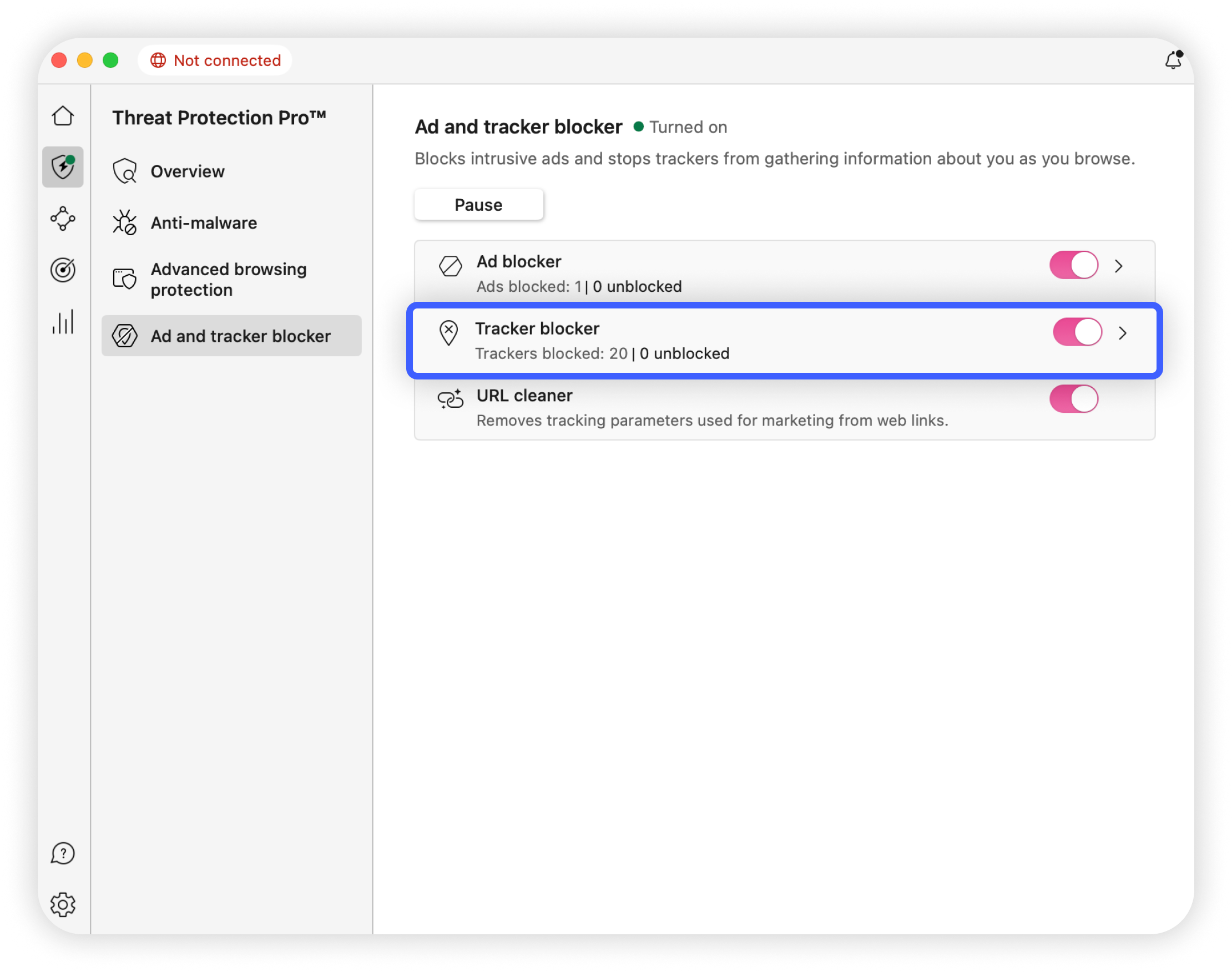 The tracker blocker, a feature of Threat Protection Pro™, prevents third-party trackers from following you online and collecting data about your habits. It actively blocks this monitoring as you browse, keeping your digital profile private from data brokers and advertisers.
