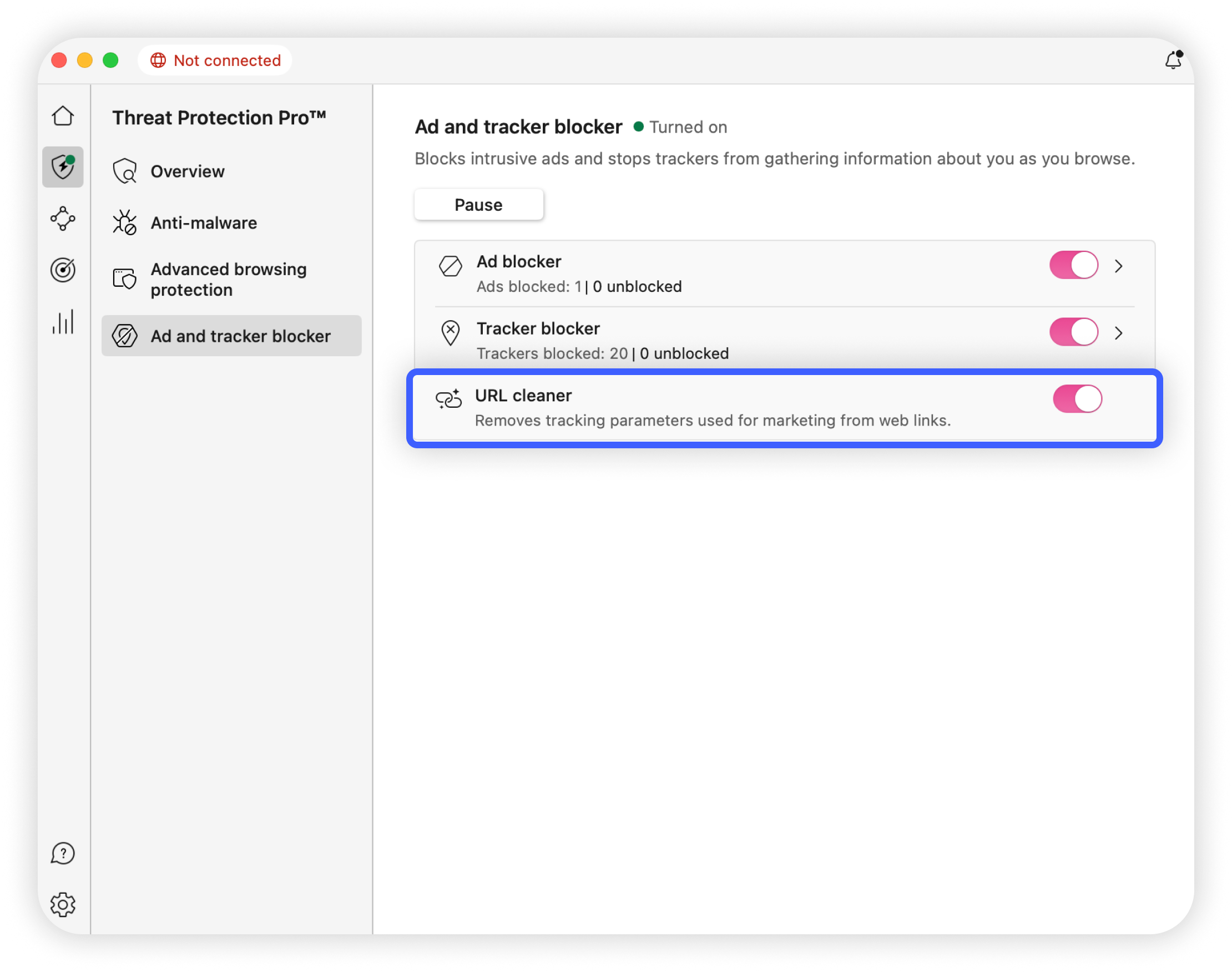 The URL cleaner, a feature of Threat Protection Pro™, automatically removes tracking parameters from web addresses. This enhances your online privacy by making it harder for sites to track you, while also making links shorter, cleaner, and safer to share.