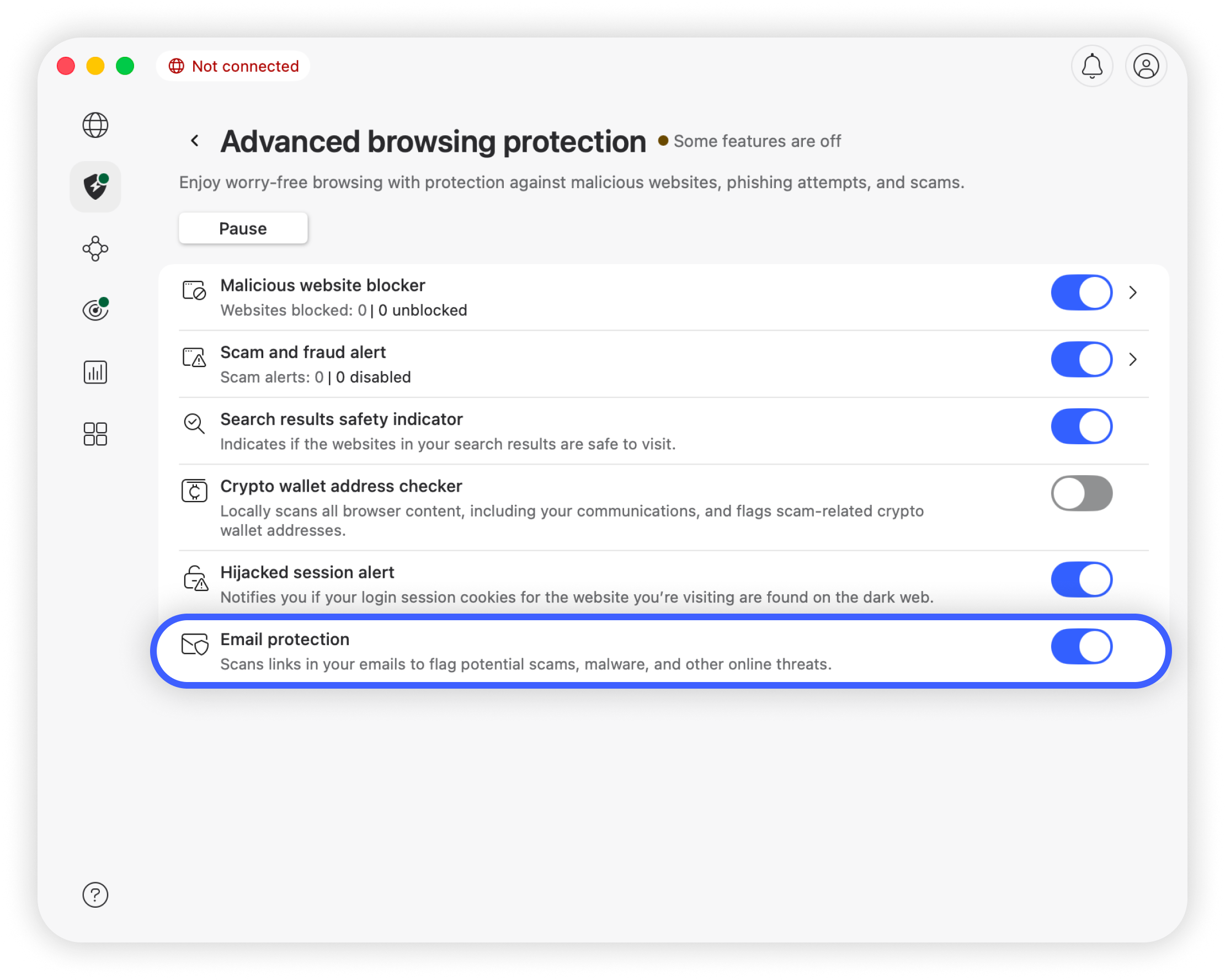 - Toggle the "Email protection" feature to the on position: