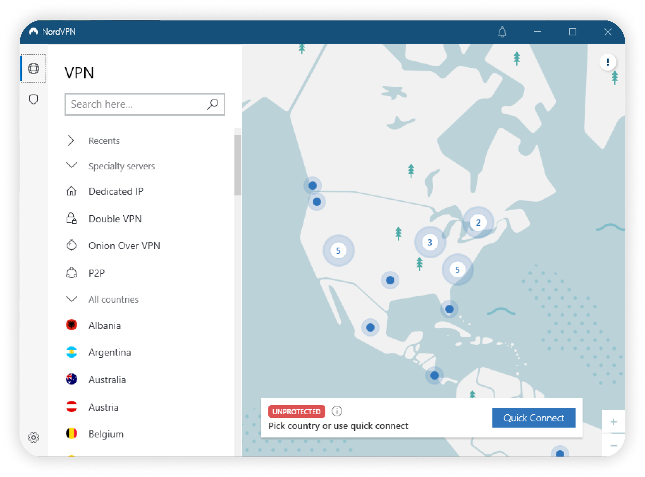 3. Para empezar a utilizar NordVPN de inmediato, solo tienes que pulsar Conexión rápida (Quick Connect) y esperar a que el estado cambie de Desprotegido (Unprotected) a Protegido (Protected). ¡Ya puedes navegar de forma segura y privada!