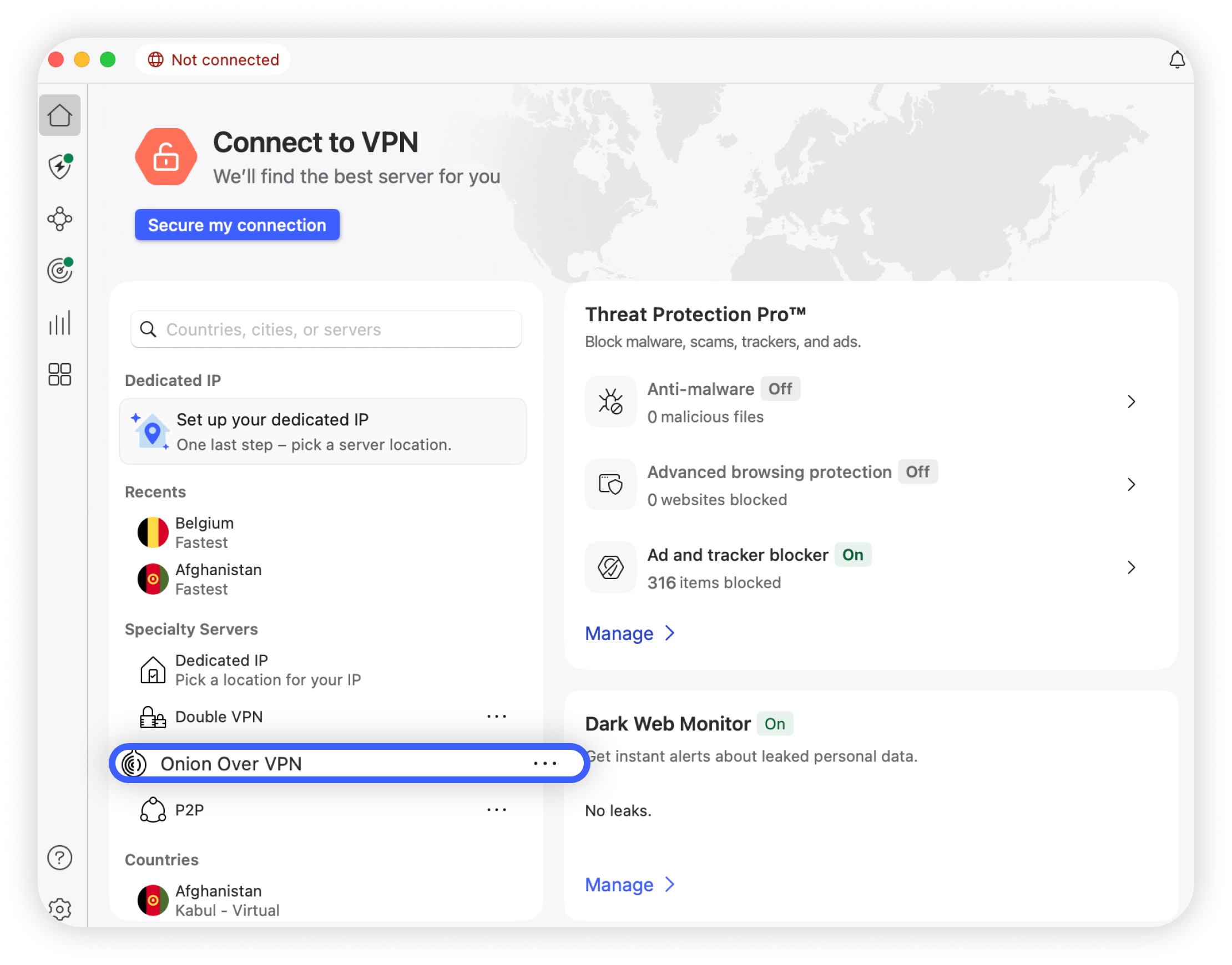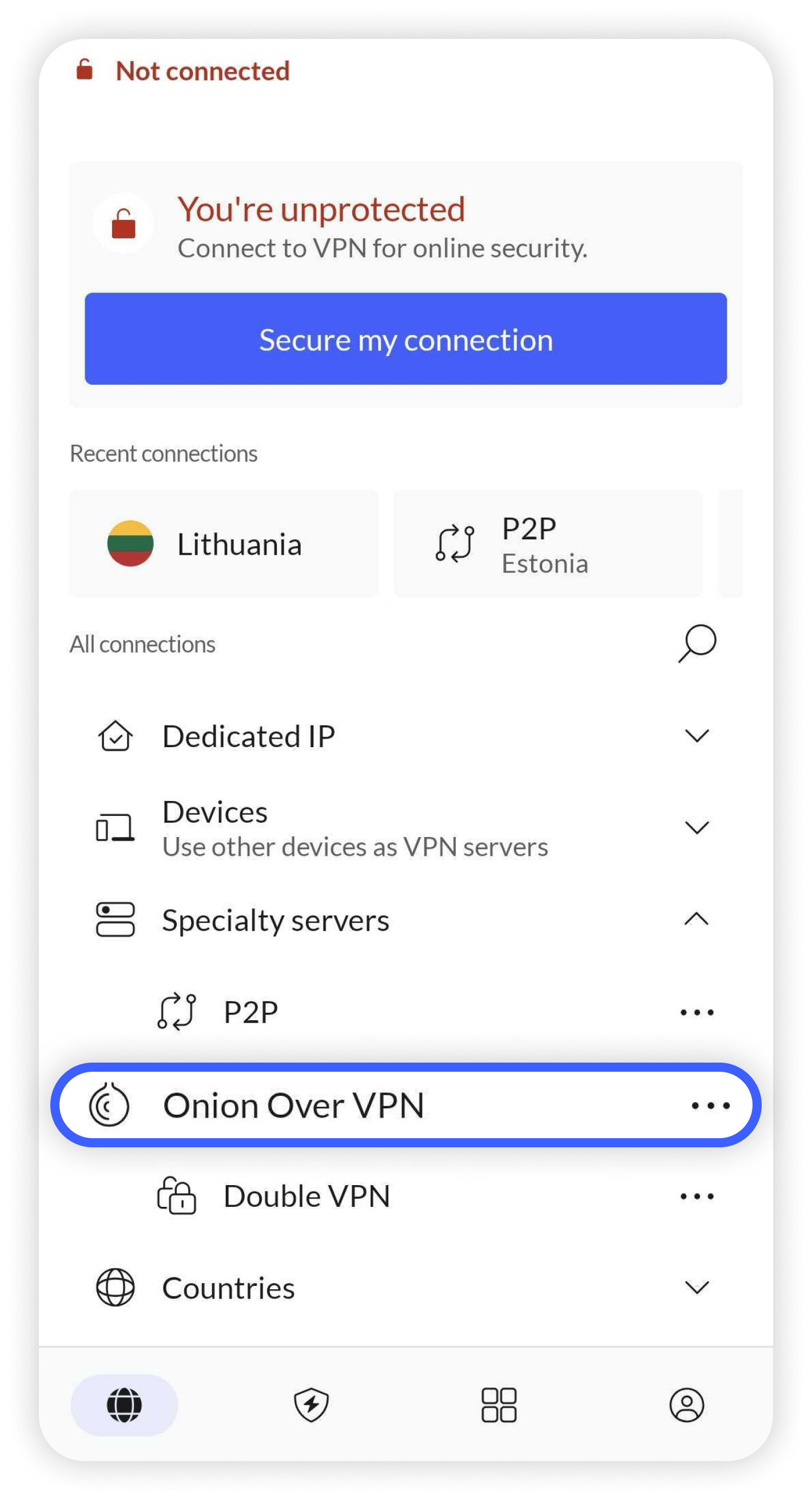 - No es necesario un navegador especial. Normalmente, hay que descargar e instalar un navegador Tor para utilizar la red Tor, pero gracias a NordVPN solo tienes que conectarte a un servidor Onion Over VPN y así podrás utilizar el navegador que quieras.