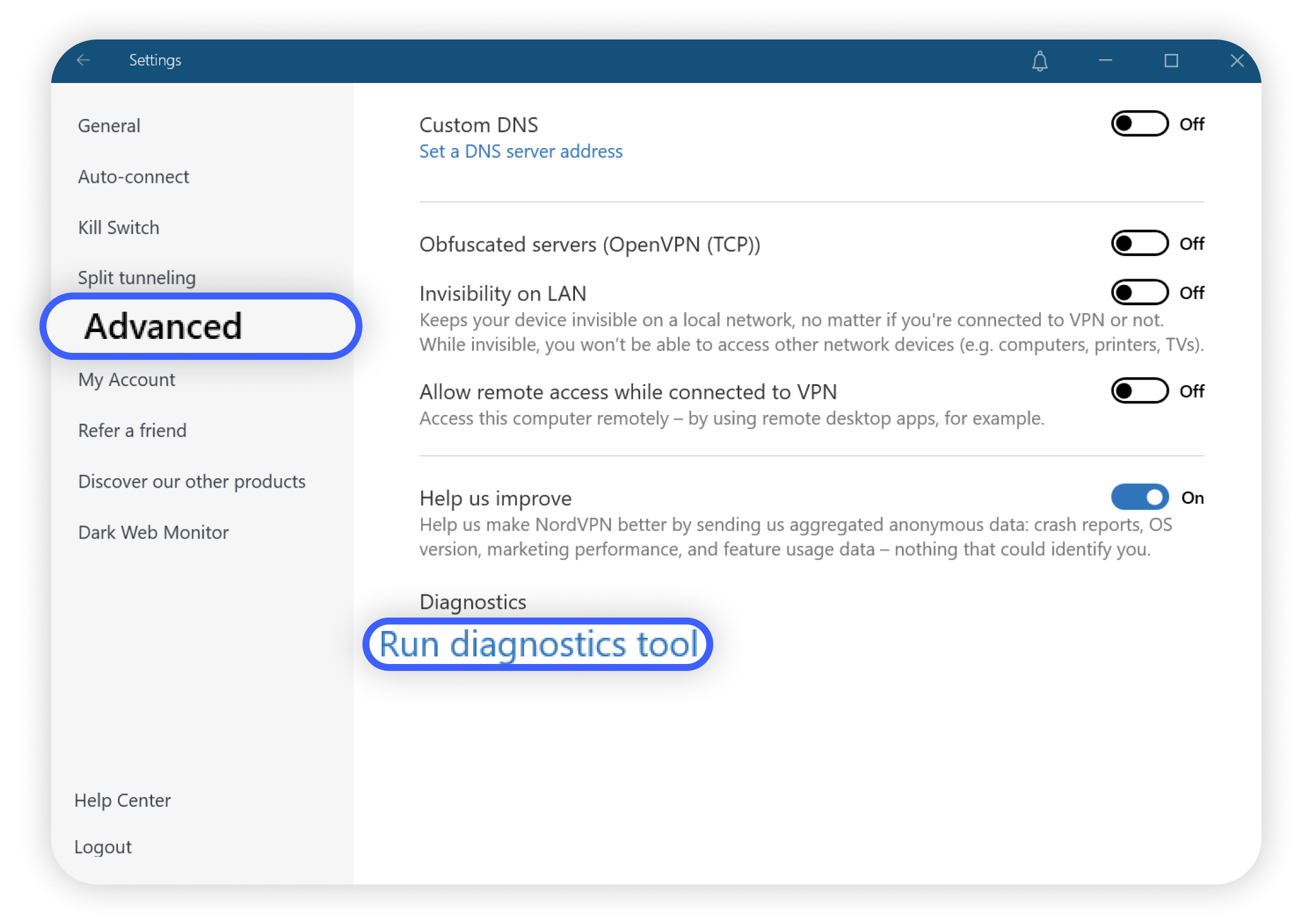 para iniciar la aplicación de diagnóstico de NordVPN.