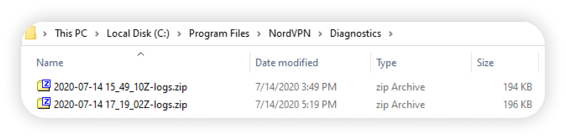 El Explorador de archivos abrirá automáticamente el directorio donde se ha guardado el informe. De forma predeterminada, los informes de diagnóstico se guardan en C:\Program Files\NordVPN\Diagnostics.