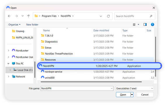 - Selecciona el archivo ejecutable de NordVPN (.exe).