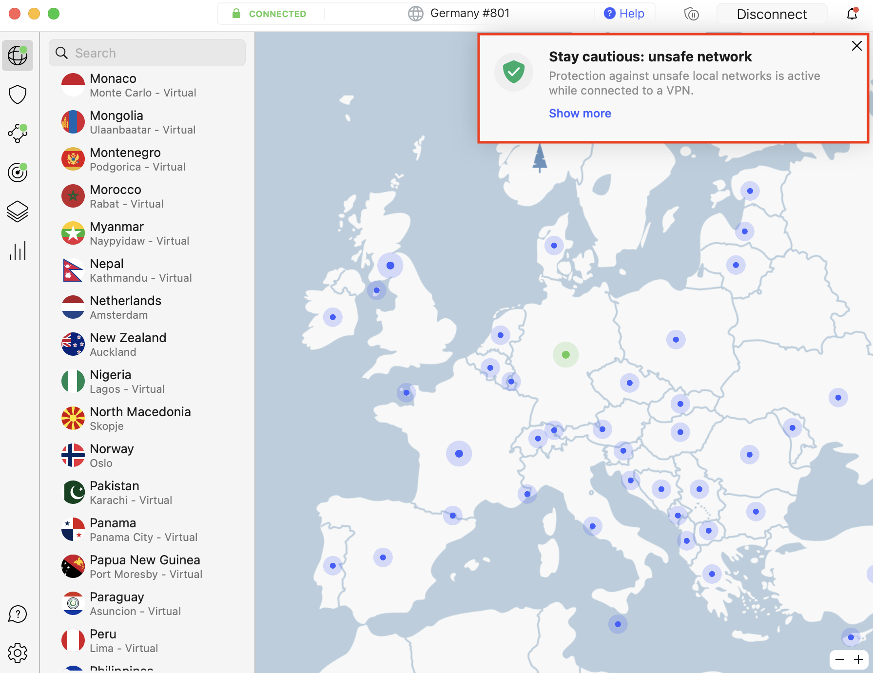 When you connect to an unsafe network, NordVPN will send you a pop-up: Stay invisible on a local network. Choose Enable protection.