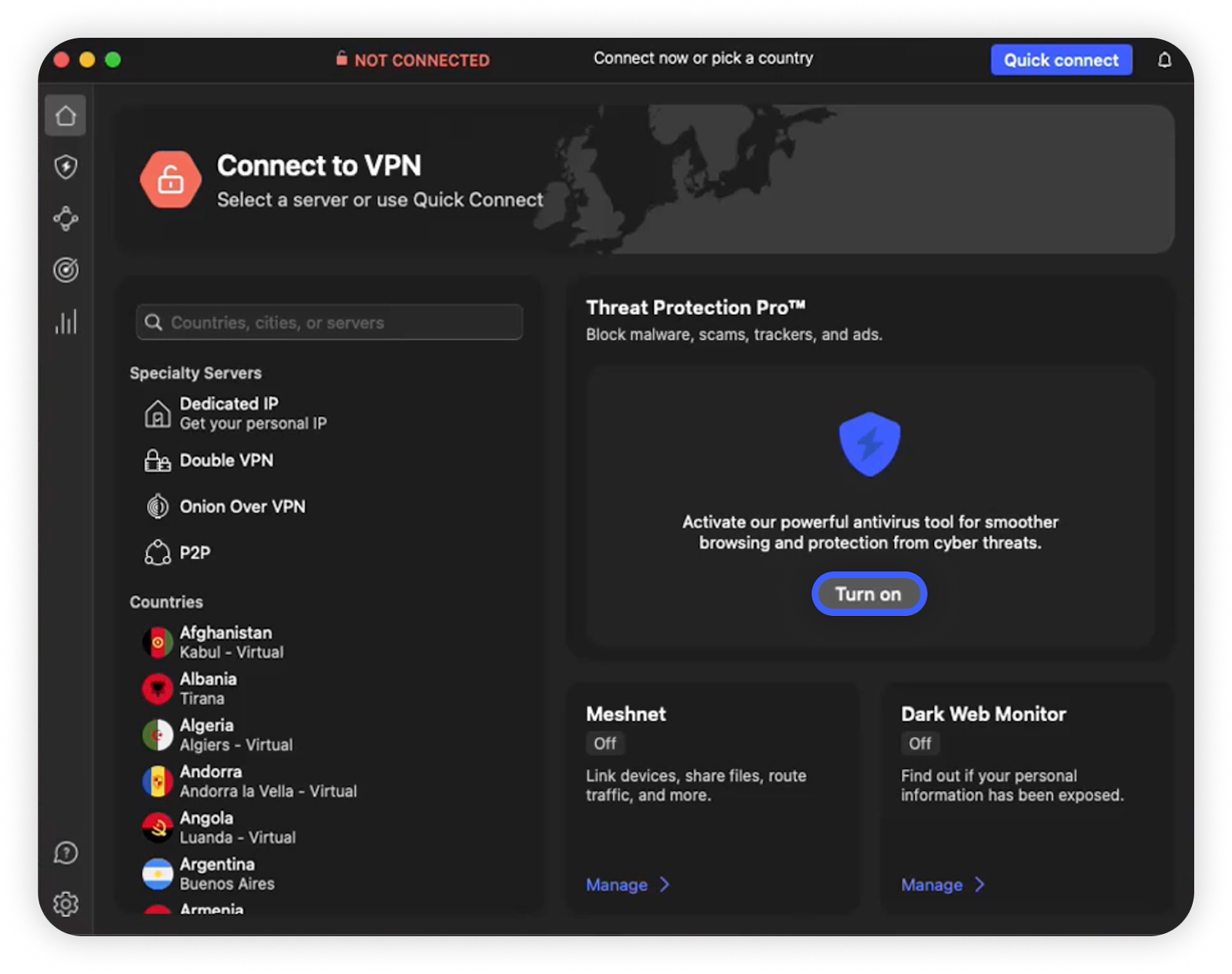 Esta función bloquea automáticamente anuncios, rastreadores y URL maliciosas, y solo está disponible con determinados planes de NordVPN. Más información sobre ¿Qué es la Protección contra amenazas Pro™ de NordVPN.