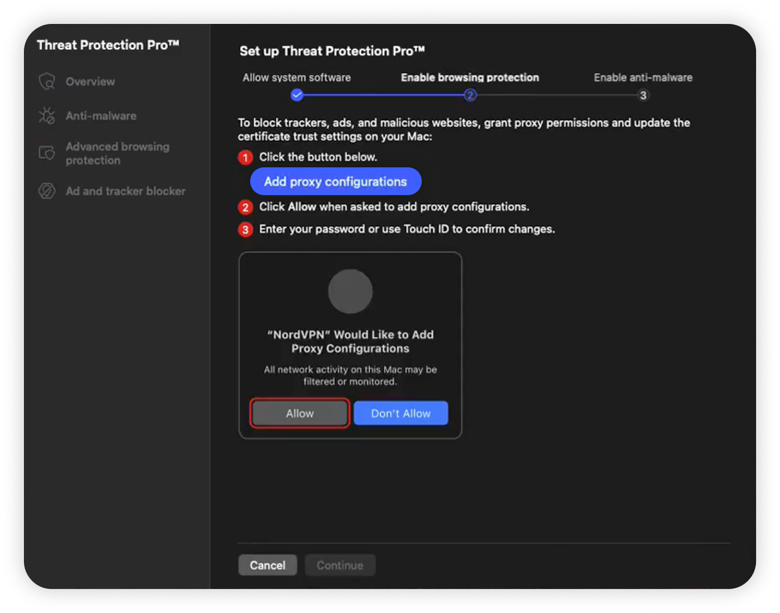 Para configurar Protección contra amenazas Pro™ en macOS, sigue los pasos que se indican a continuación: