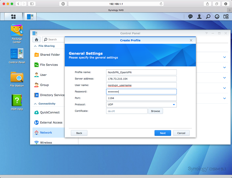 This is the tutorial on how to set up your Synology NAS based on DiskStation Manager (DSM) 5.1 version. The instructions were made for connection to the Swedish #3 server. Special thanks to @davmojo for providing these instructions.