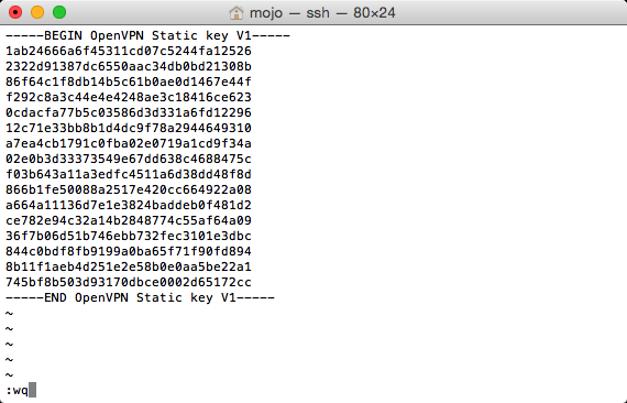 16. Open the terminal window again. Press A and then paste the text you have copied from the TLS-auth.key file. It should look similar to the text below.
