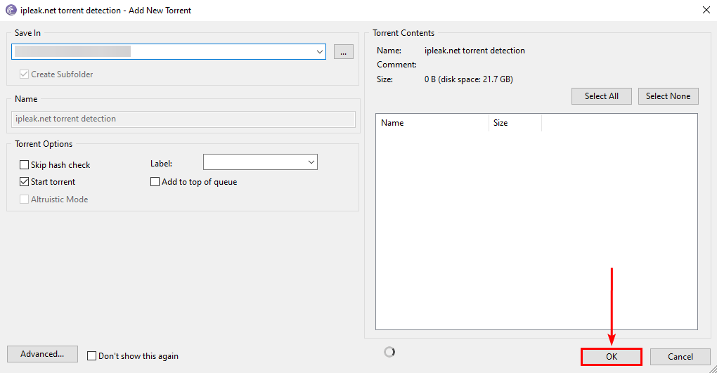 Importante: deja ipleak.net abierto. - Cuando se abra BitTorrent, haz clic en Aceptar (OK) para añadir el torrent.