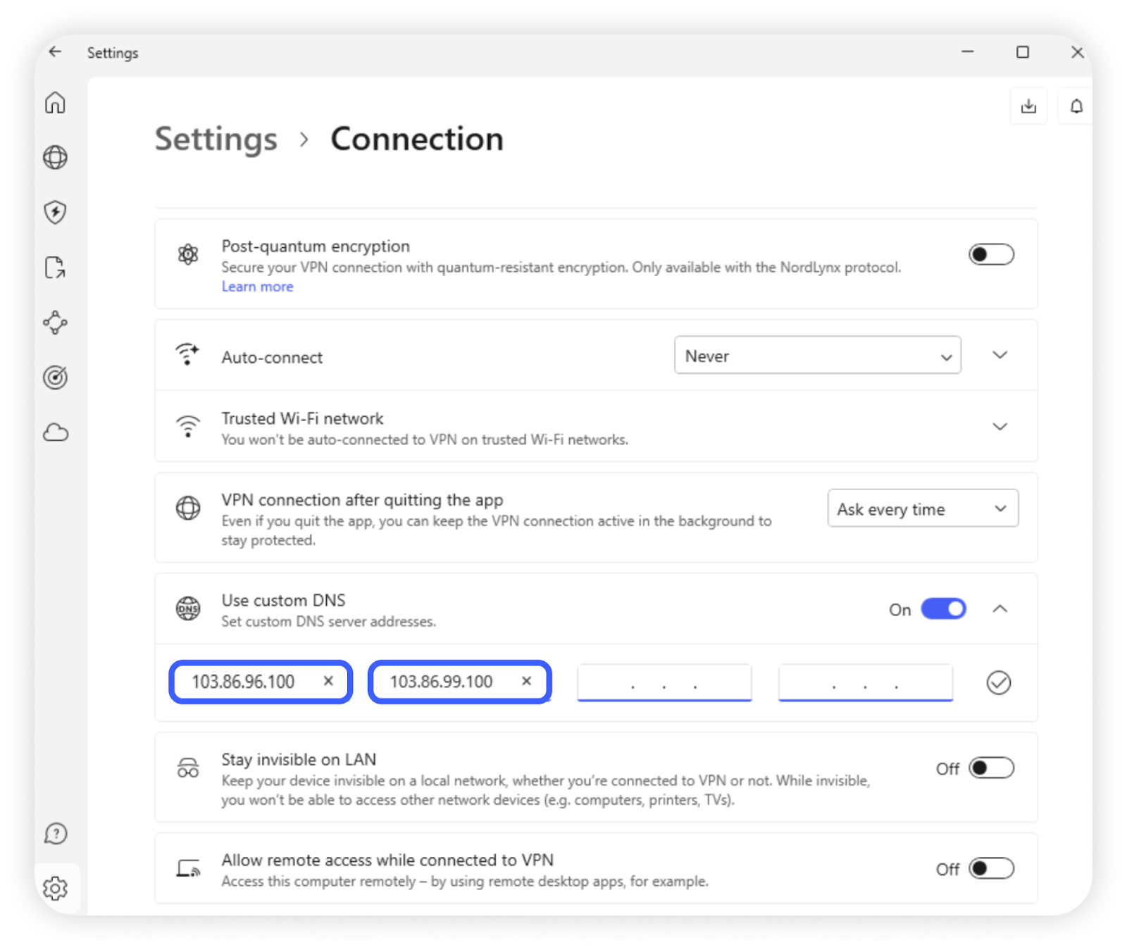 Añadir los servidores DNS de NordVPN desde la aplicación te asegura que están siendo utilizados mientras tienes conexión y puede disminuir las posibilidades de que cualquier aplicación de terceros interfiera.