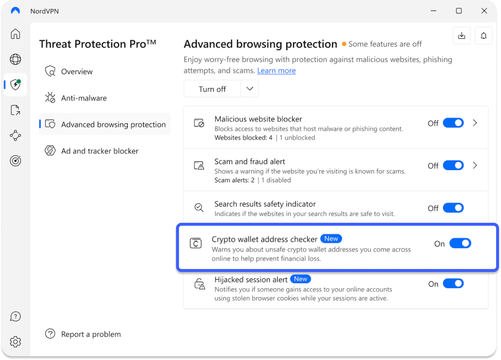 La función Comprobador de direcciones criptowallet de Protección contra amenazas Pro™ te permite identificar direcciones de carteras de criptomonedas potencialmente peligrosas mientras navegas por la web.