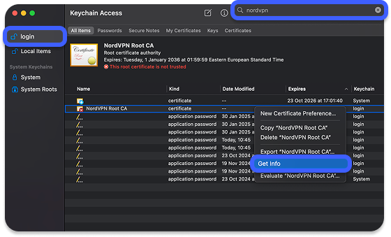 - Une fenêtre Trousseau d’accès s’ouvrira. Localisez NordVPN Root CA dans la section Connexion.Cliquez dessus avec le bouton droit et sélectionnez Obtenir les informations.