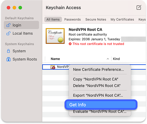 - Dans la fenêtre Trousseau d’accès, Trousseau de session, cliquez avec le bouton droit sur le certificat NordVPN Root CA et sélectionnez Obtenir les informations.