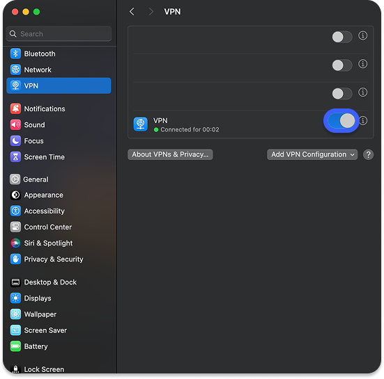 Les étapes suivantes vous expliqueront comment configurer une connexion IKEv2 manuelle sur votre appareil macOS Sonoma ou version ultérieure.