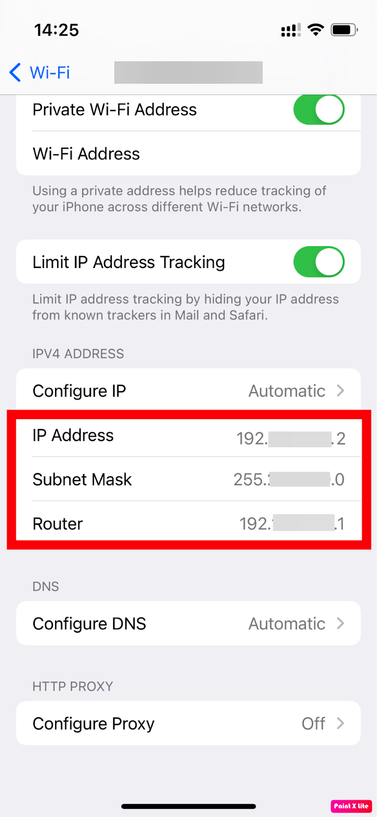Tap the i icon next to the connected WiFi and then scroll down to find the IP address info: