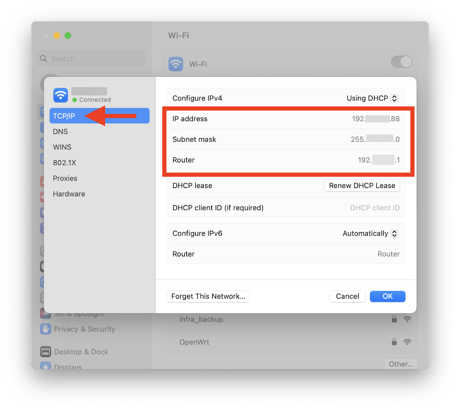 Open WiFi in System Settings, click Details next to the connected WiFi, then select TCP/IP: