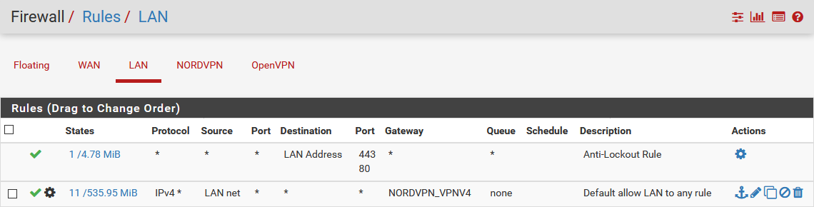10. Naviguez vers Firewall > Rules > LAN et supprimez la règle IPv6. Modifiez également la règle IPv4.