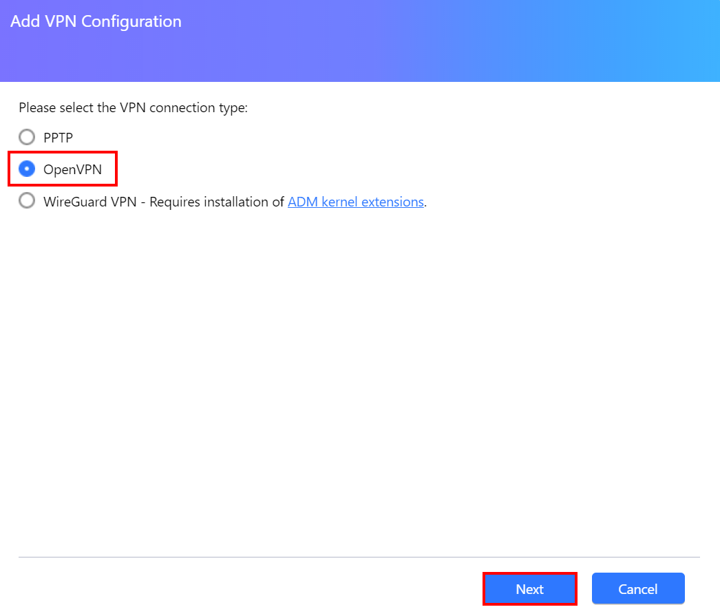 - Dans la fenêtre Add VPN configuration, sélectionnez OpenVPN et cliquez sur Next.