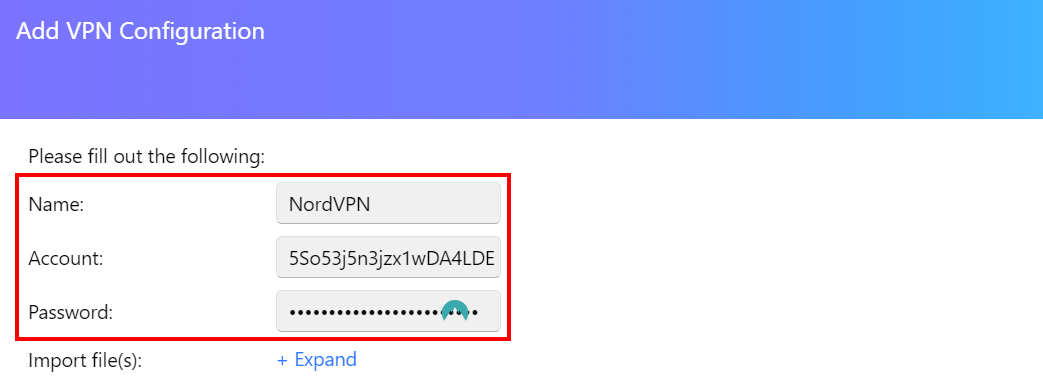 - Account : votre nom d'utilisateur pour le service NordVPN