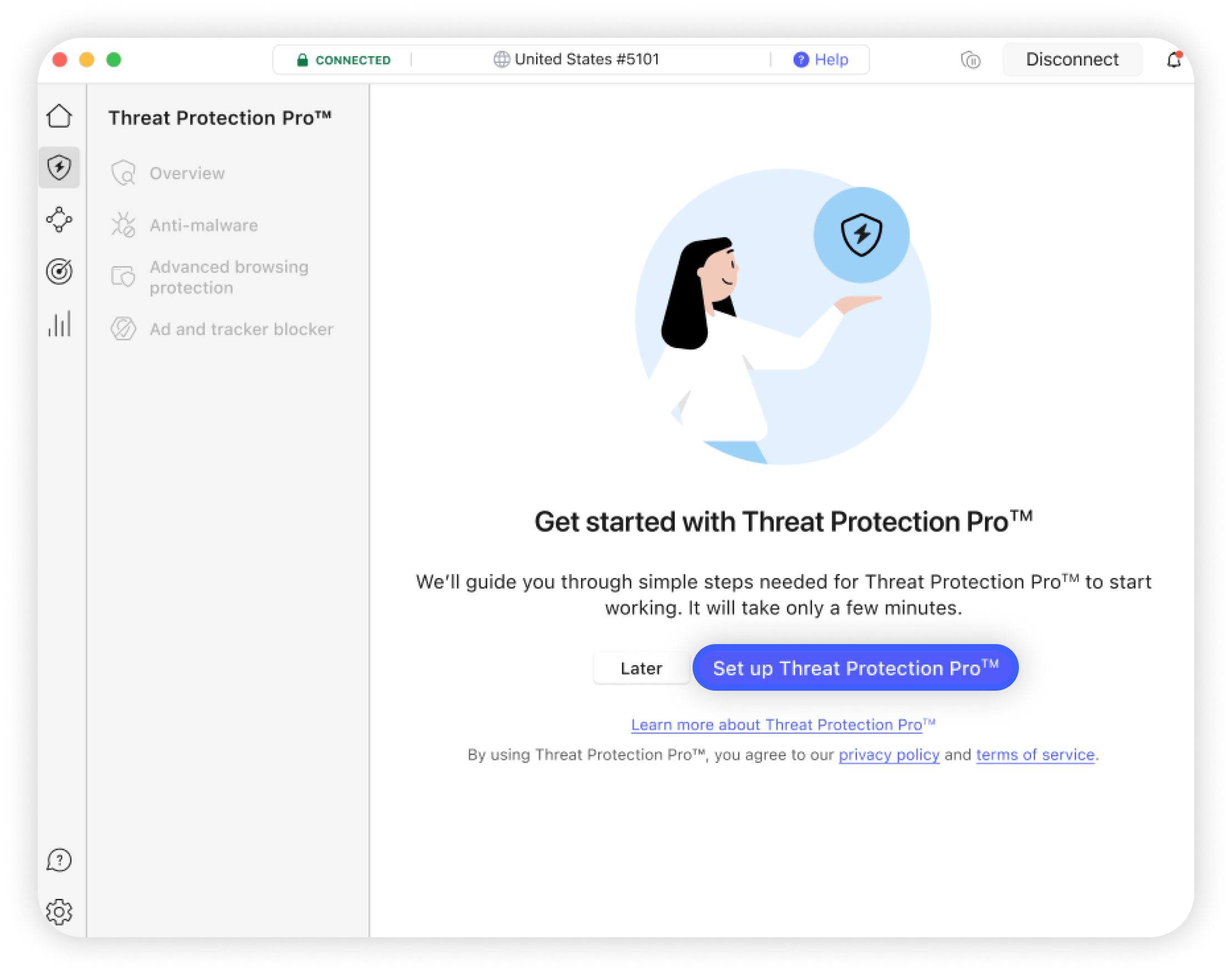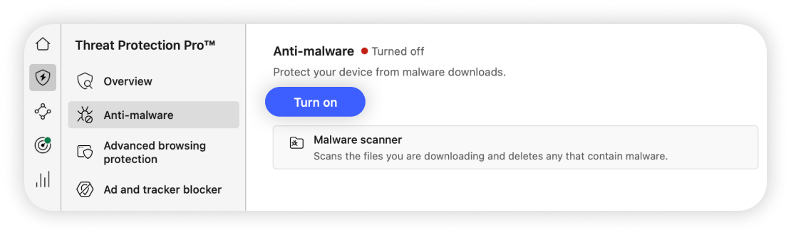 Lisez le guide ci-dessous pour activer et commencer à utiliser Protection Anti-menaces Pro™ sur les anciennes versions de macOS telles que Monterey, Ventura ou Sonoma. Si vous utilisez une version plus récente de macOS, consultez Activer Protection Anti-menaces sur macOS.